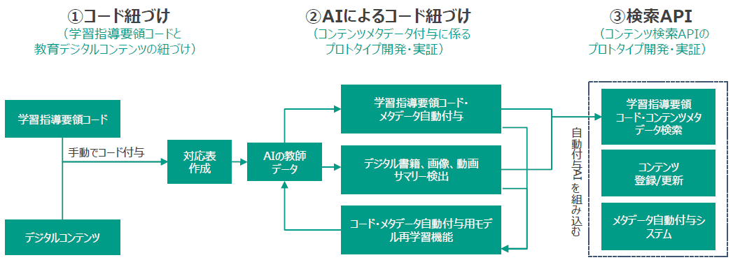 本事業では、教育デジタルコンテンツとなりうる様々なデータと学習指導要領コードとの紐づけに関する調査・検証、AIを活用した紐づけのためのメタデータ自動付与システムのプロトタイプ開発・実証、紐づけた教育デジタルコンテンツを利用するためのコンテンツ検索APIのプロトタイプ開発・実証を行いました。
