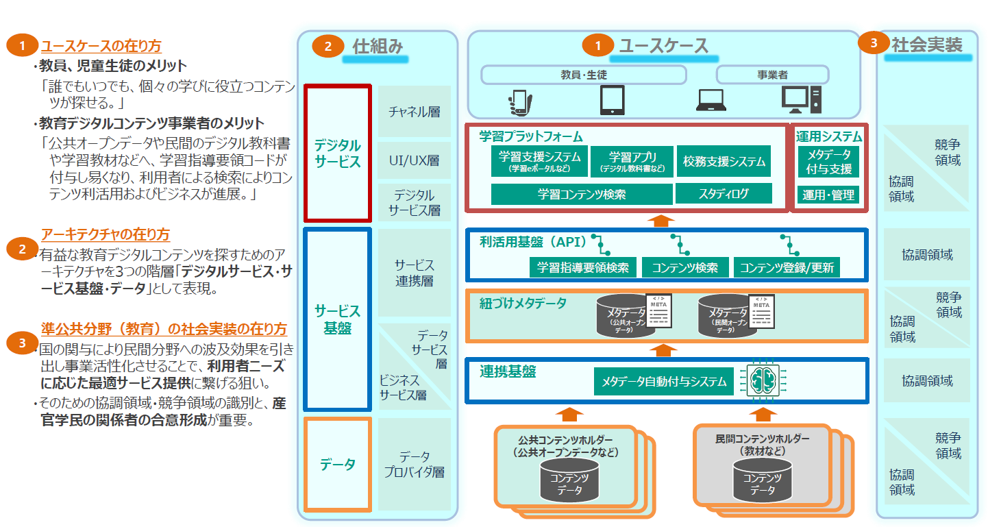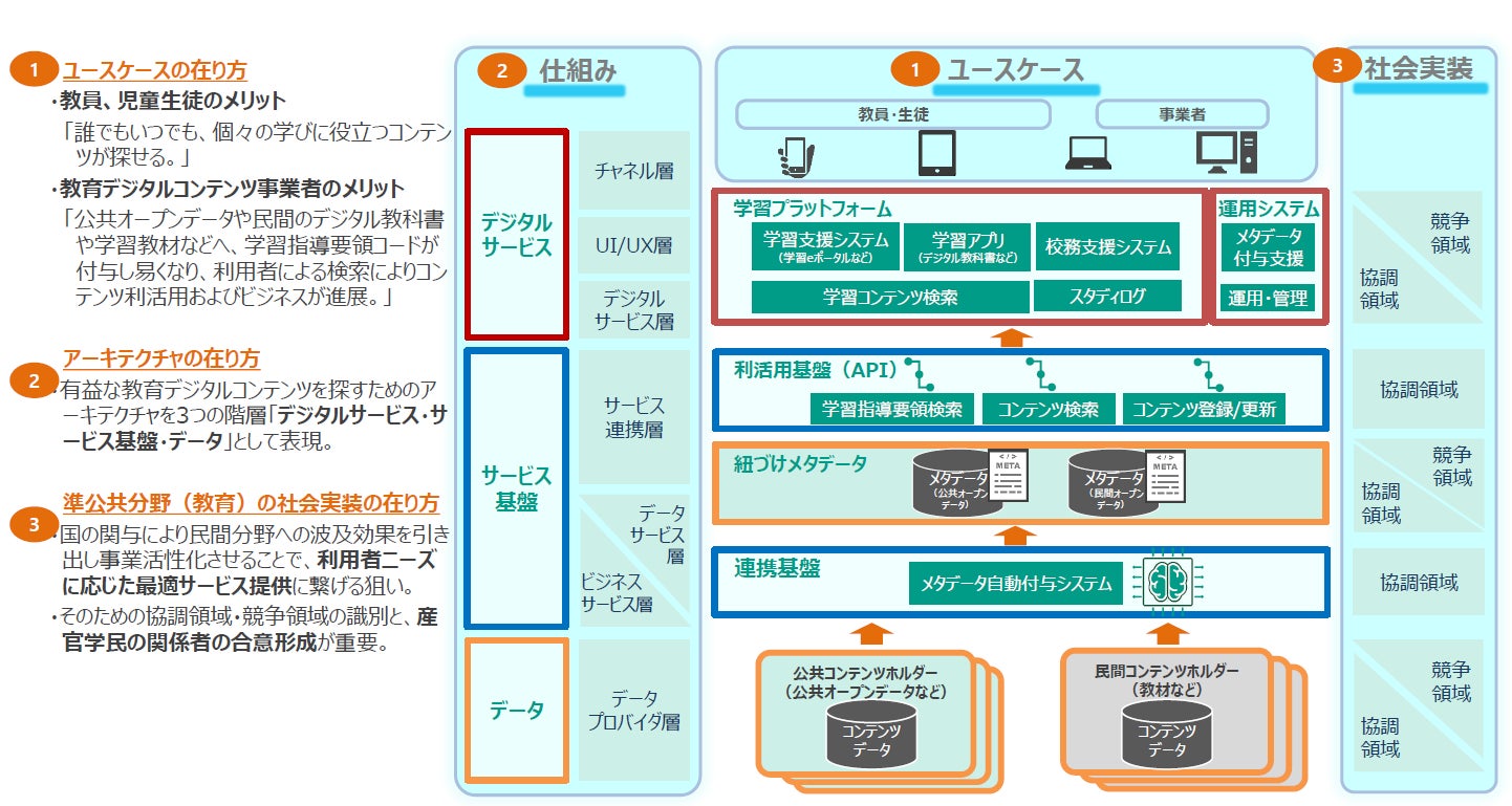 さらに、教育関係者や有識者からのヒアリング情報を基に、将来に向けた教育デジタルコンテンツのさらなる利活用について課題の整理と提言を行っています。ガイドラインやルールの検討、データの標準化やオープン化と有益なコンテンツの増補、コンテンツ紐づけの改善、情報システム基盤の整備などの課題があり、様々なステークホルダーや関係省庁との情報共有や連携が必要となることを確認し、望ましい将来に向けたアーキテクチャのイメージを提案しました。