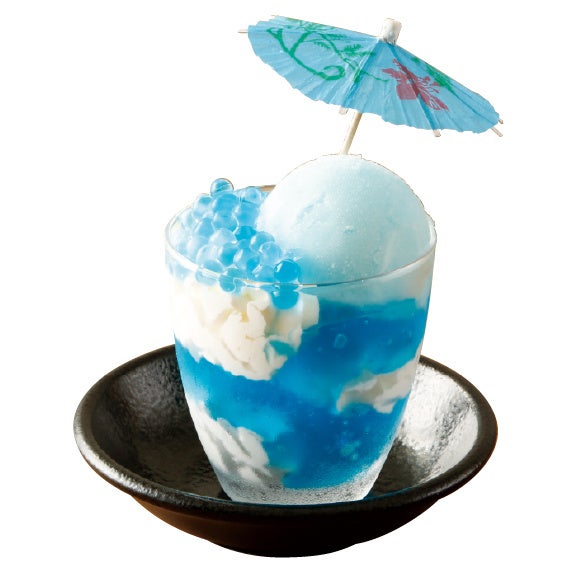 ブルーのゼリーと白のホイップクリームが層をなす、見た目も爽やかなデザートです。