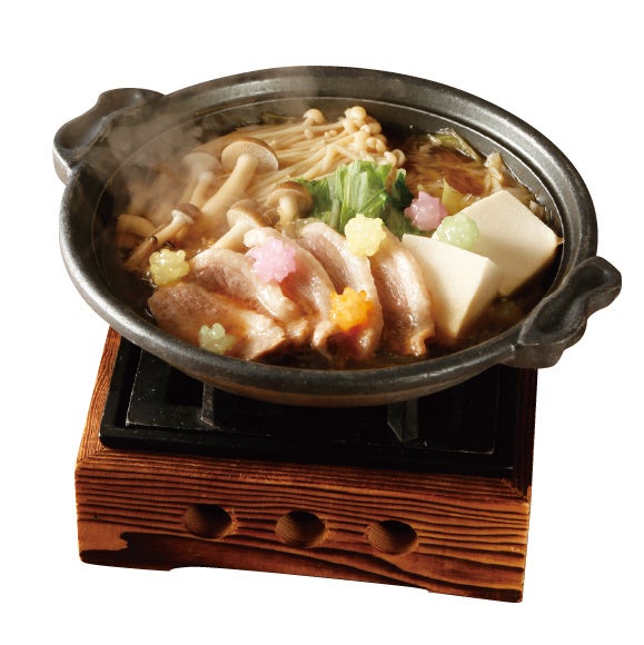 溶け出す金平糖がコクを引き立てる合鴨のすき焼きです。付属の卵黄に絡めてお召し上がりください。