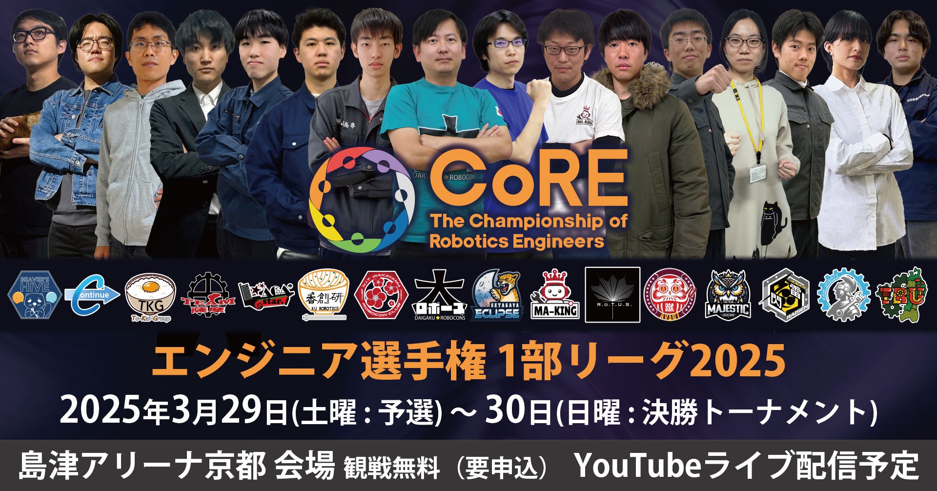 エンジニア選手権 The Championship of Robotics Engineers、通称CoRE(コア)とは次世代のエンジニア”挑戦的共創人材”を育成するための、ロボット競技を核としたエンジニア選手権です。10歳以上であれば年齢制限無く、生徒・学生から現役エンジニア、初心者から経験者まで誰でも参加でき、チームで大型ロボットを開発する過程でエンジニアリングとチームワークを総合的に楽しく学べる機会を提供します。エンジニア個人やそのチーム自体の評価が最も重要であり、当日のロボット競技の結果だけではなく、チーム活動や提出資料等の総合力を加味した総合優勝制度や個人表彰制度を設けています。これにより様々な観点でエンジニア個人やチームとしての能力を測り、これまでスポットライトが当たることが少なかったエンジニア個人を評価し、本機構が定義する次世代のエンジニア“挑戦的共創人材"とチームを育成します。