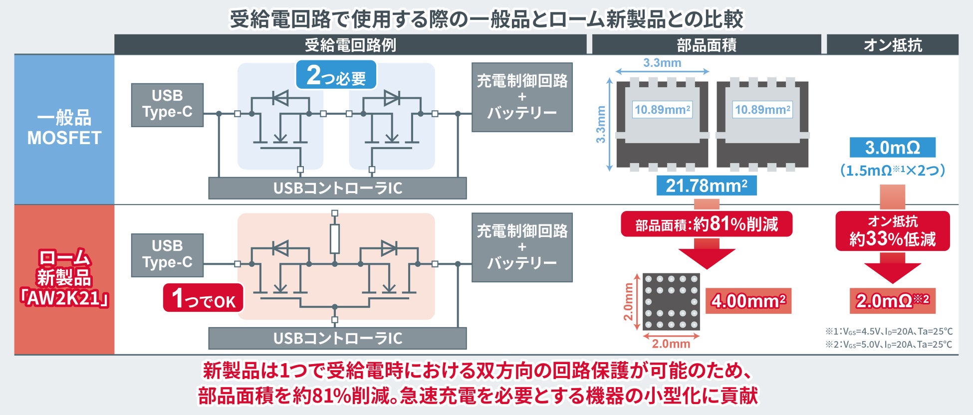 ロームは、この課題を解決するために、大電力の急速充電に対応できる超小型パッケージかつ低オン抵抗のMOSFET「AW2K21」を開発しました。