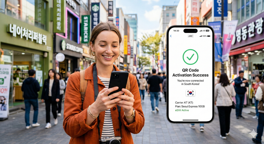 Webサイトで購入後、発行されるQRコードを読み取るだけで設定が完了。開通手続きは韓国到着後に行うことができ、物理SIMカードの差し替えの手間を排除しました。音声通話を利用される場合は現地法規に基づきパスポート情報のアップロードが必要ですが、データ通信のみを利用される場合はアップロード不要でより迅速に利用を開始いただけます。