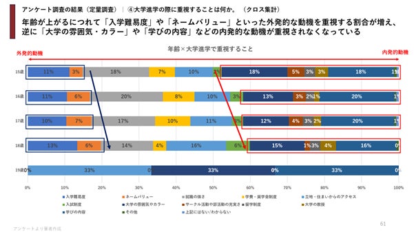 インタビュー調査では、偏差値や大学のネームバリューよりも「自分がやりたいことができるか」「新しい可能性や出会いがあるか」「自分が研究したい分野の授業が充実しているか」など、内発的な動機から進路を決定する若者の姿が鮮明になりました。