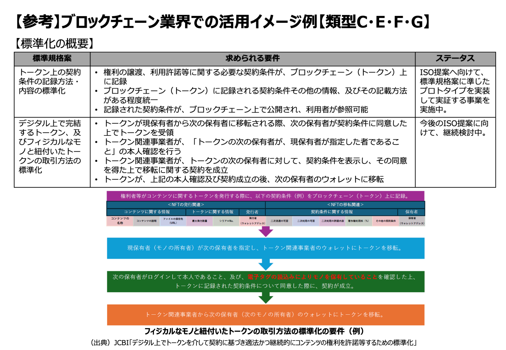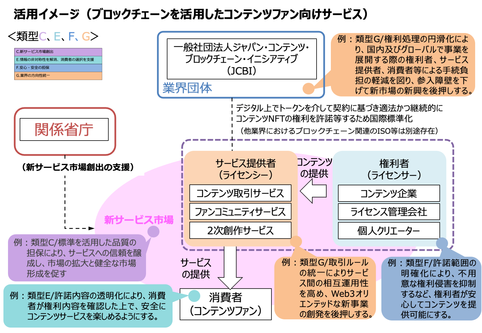この中間取りまとめは、サービス分野における標準化の有用性や活用方法の類型、標準化・普及促進の各段階で重要となる事項や留意点を整理するために、本委員会の議論をまとめたものです。その中で、サービス分野の標準化事例の1つとして、「コンテンツ領域においてブロックチェーンを活用したサービス分野」におけるJCBIの取り組みが紹介されました。