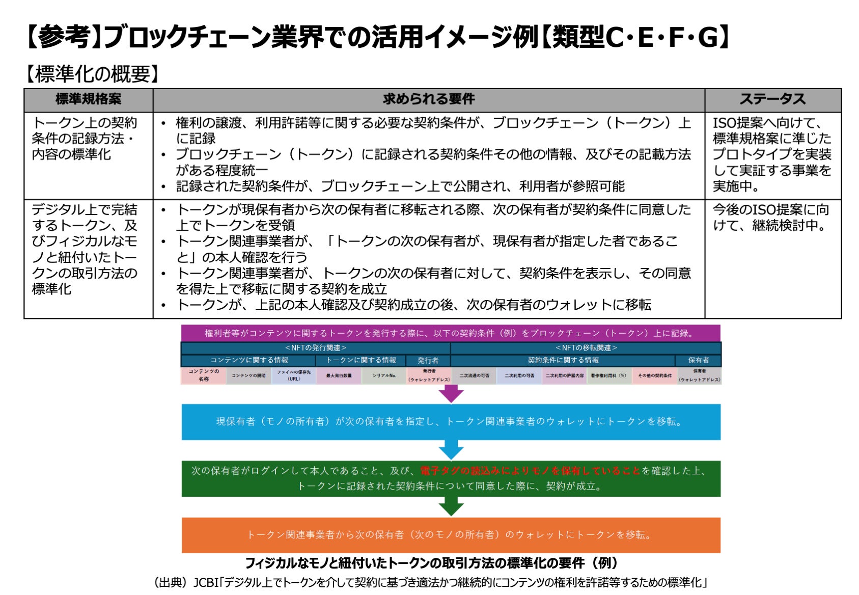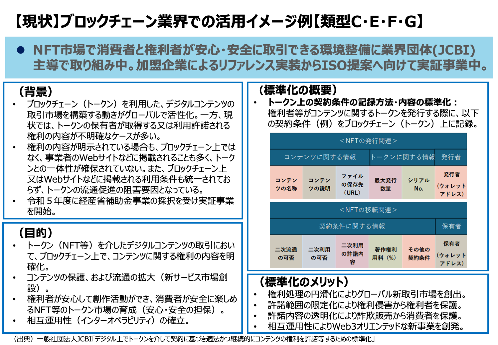 ブロックチェーンの関連領域でいうと、暗号資産領域は新規産業であるため、ゼロベースでスピード感をもってルール作りが進められた。一方で、NFT(Non-Fungible Token)領域は、既存のコンテンツ産業の企業間において、関連する法律や商習慣との整合性をとりながらルールを作るハードルがあるため、一定の時間を要するものの、標準化の議論を通じて産業界内において合意形成を図りルールメイキングをすることで、企業の当該 NFT 領域の事業への参入障壁を下げられると共に、消費者の安心感にもつながることが期待できる。