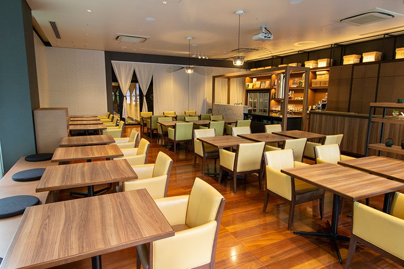 キイロイトリを表現したカボチャのスープや、リラックマがくつろぐ和風のキーマカレーなどの料理3皿と、コリラックマを模したプリンなどのデザートプレート、登場キャラクターをイメージした日本茶ラテを2種類から1種類選べるほか、日本茶と、日本茶を使ったノンアルコールカクテル「モクテル」を飲み放題!リラックマたちが江戸城を普請した「徳川家康公」になりきった姿をデザインしたオリジナルのペーパーランチョンマット付き。