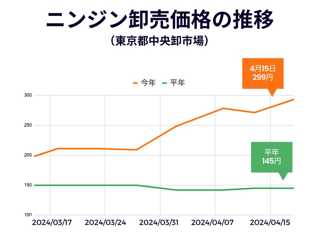 昨年の夏の暑さや雨不足による発芽率の悪さ、暖冬により生育が早まったことによる「出荷前倒し」の影響などにより、現在ニンジンの出荷量が減少し、品薄感が出ています。農林水産省統計部が発表した青果物卸売市場調査によると、ニンジンの価格は2024年4月から急上昇しており、4月15日の東京都中央卸売市場の卸売価格は1キロあたり299円と前平年同時期(1キロあたり169円)と比べ、約2倍に上昇しています。※