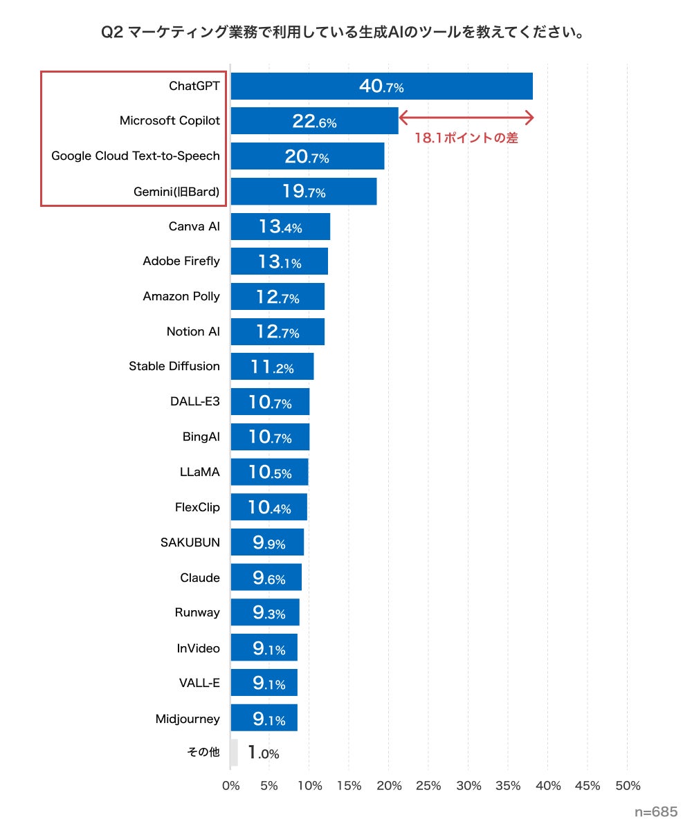 また、マーケティング業務で利用している生成AIのツールを聞いたところ、最も利用されているのは、テキスト生成の「ChatGPT」(40.7%)でした。ほぼ20ポイントの差でテキスト生成の「Microsoft Copilot」(22.6%)、音声生成の「Google Cloud Text-to-Speech」(20.7%)、テキスト生成の「Gemini(旧Bard)」(19.7%)が続きました。