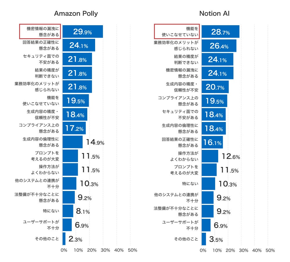 また、【生成AIツールの満足度】で最も満足度の高かった「Amazon Polly」は「機密情報の漏洩に懸念がある」、「Notion AI」は「機能を使いこなせていない」が課題と感じていることが分かりました。