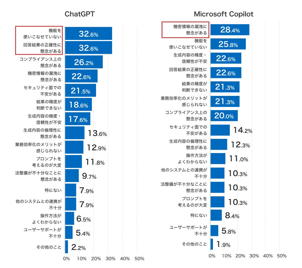 現状、「ChatGPT」の〝独り勝ち〟の感が強いですが、その満足度は特に高いわけではなく、機能を使いこなすこと、回答結果の正確さへの懸念が課題となっています。