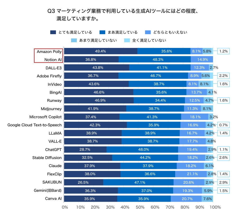 また、「満足している」が最も高いのは、音声生成の「Amazon Polly」とテキスト生成の「Notion AI」(ともに85.1%)ということが分かりました。