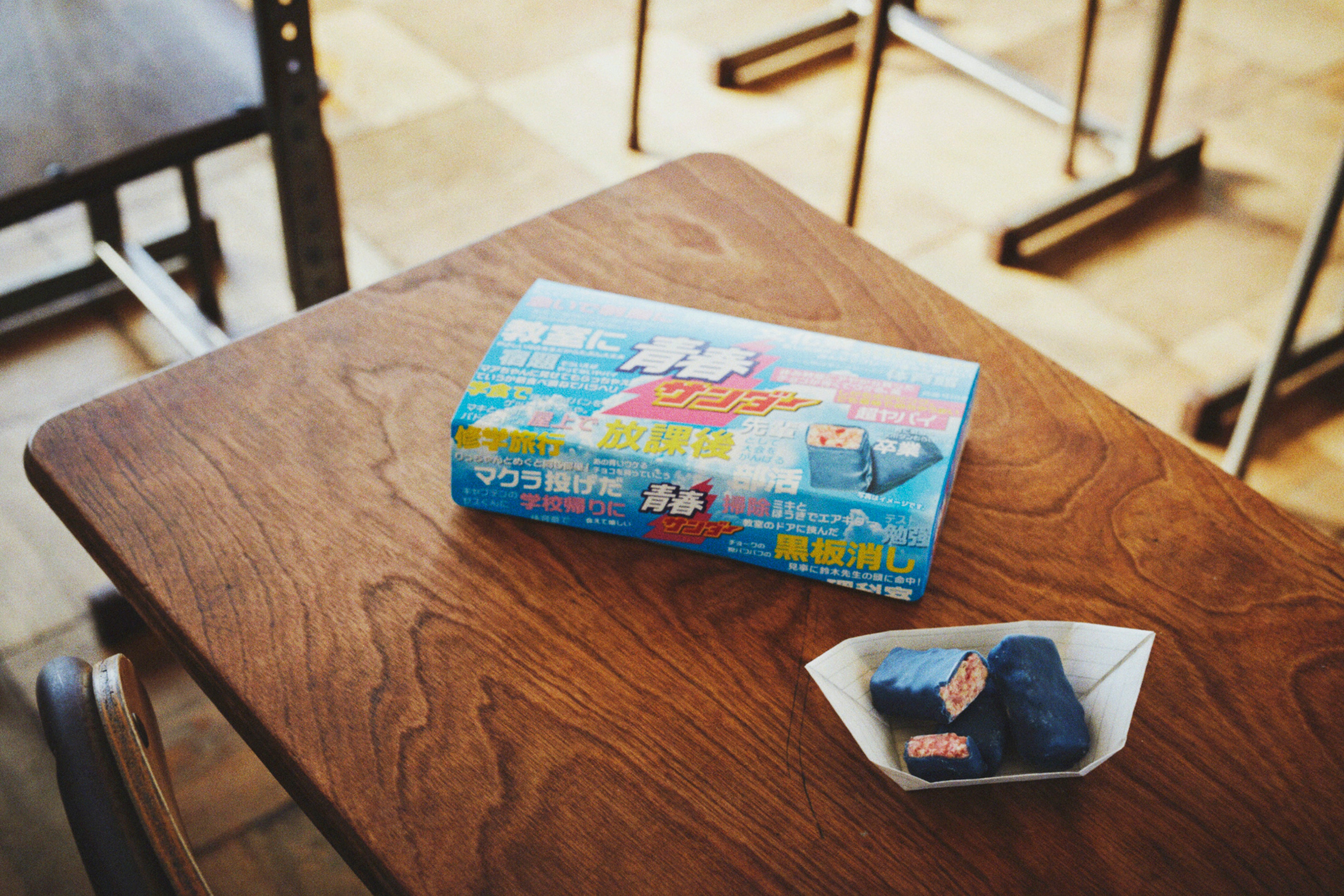 『青春サンダー』は、サクサク食感のバタービスケットとフリーズドライいちごに天然の青色色素である「バタフライピー」使用の青いチョコレートをコーティングしたチョコバーです。青いチョコレートといちごの甘酸っぱい味わいで、バレンタインの原点と言えるあの頃の青春時代を思い出しながらお楽しみください。