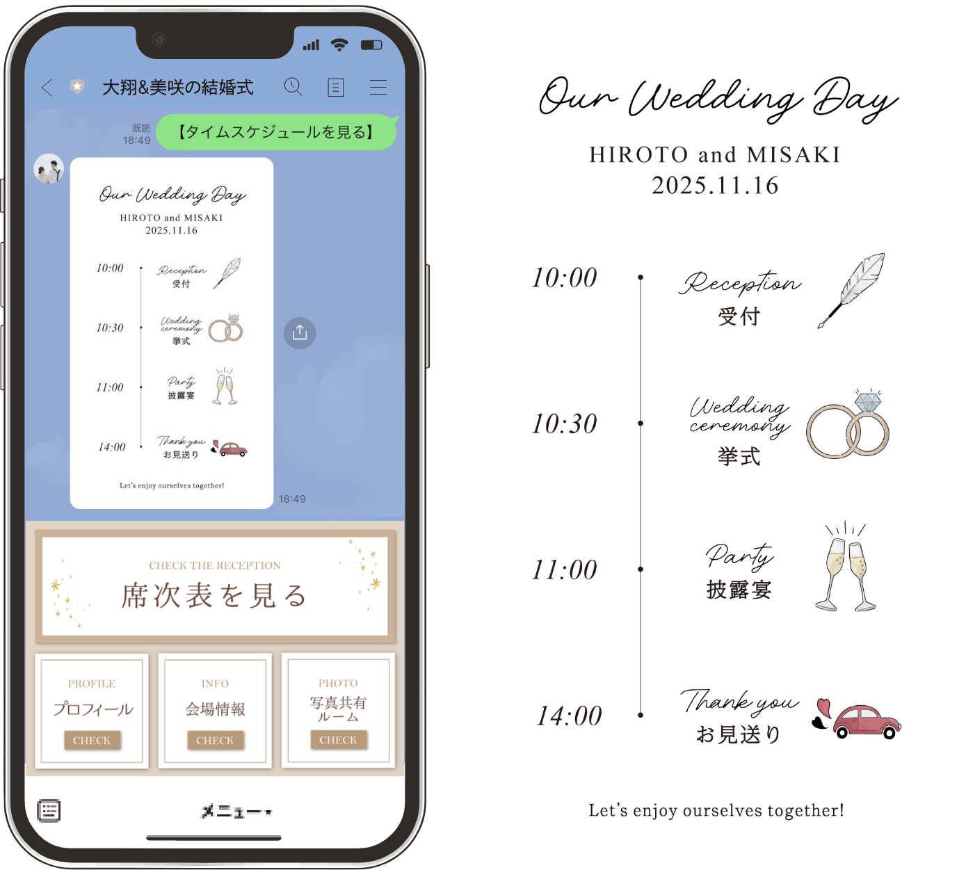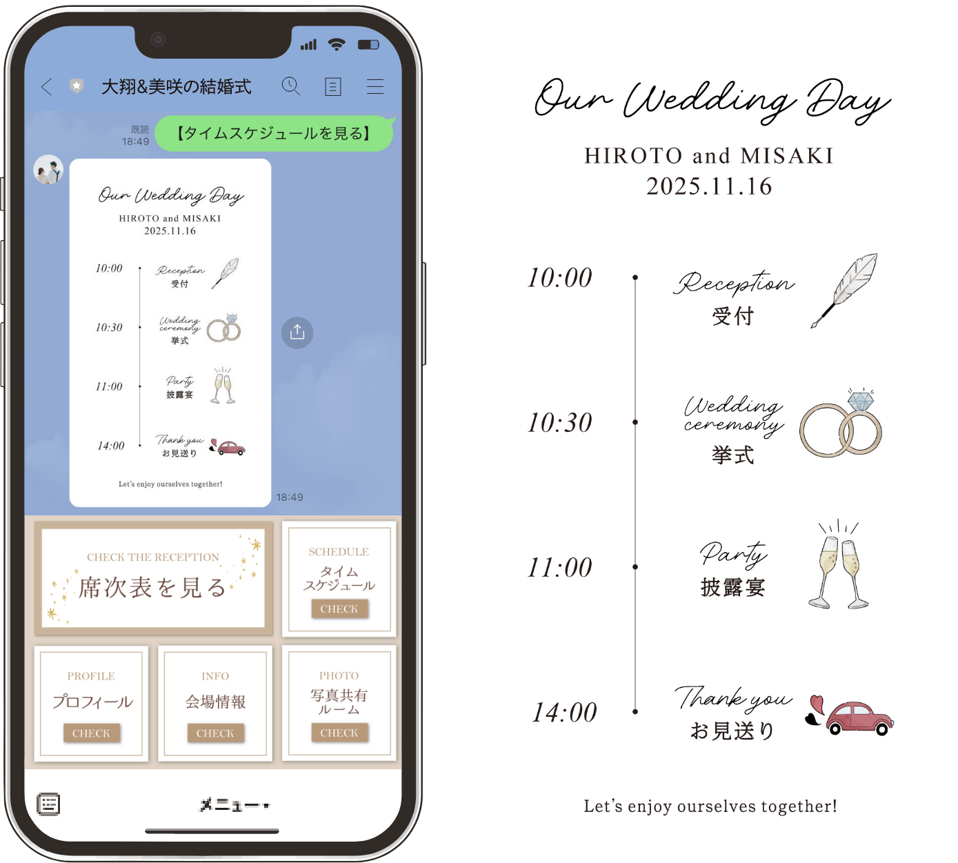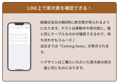 LINE公式のご納品時には「Coming Soon」が表示され、挙式日当日の朝8時にメニューが表示されます。