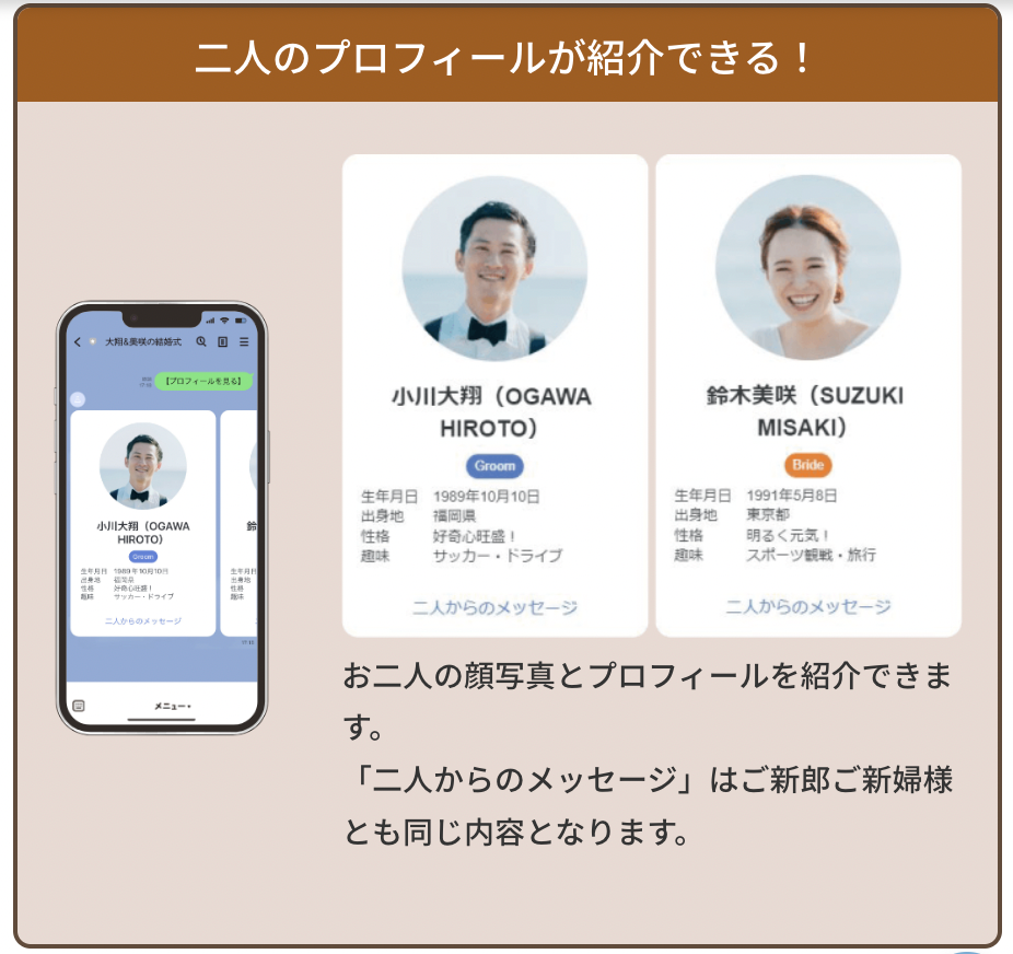 二人の前撮り写真や思い出の写真、幼少期やゲストとの思い出の写真を9枚までスライド形式で表示することが可能です。
