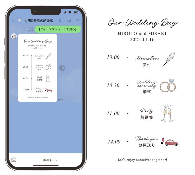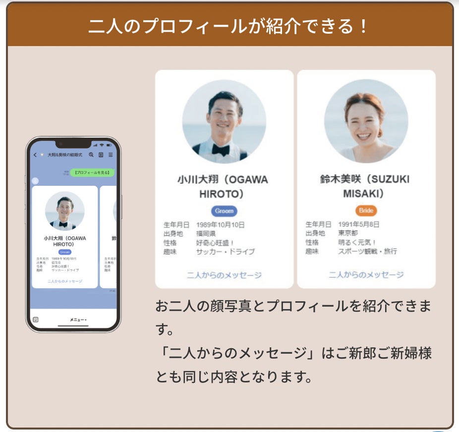 ゲストがお二人専用のLINE公式アカウントに登録すると、新郎新婦が出逢ってから結婚式当日までの記念日をしるした「お二人のLOVE STORY」動画をご覧いただけます。