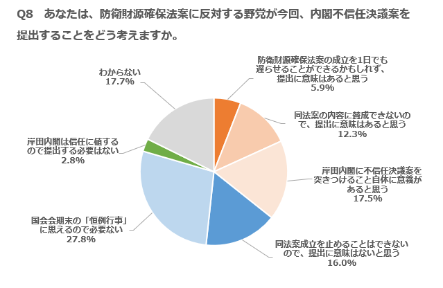野党が防衛財源確保法案に反対して内閣不信任決議案を提出することについて「国会会期末の『恒例行事』に思えるので必要ない」が27.8%で最多となり、「岸田内閣に不信任決議案を突きつけること自体に意義があると思う」17.5%、「同法案成立を止めることはできないので提出に意味はないと思う」16.0%と続いた。(Q8)