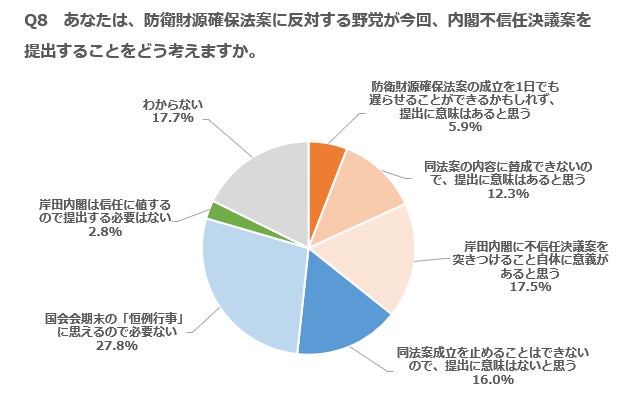 野党が防衛財源確保法案に反対して内閣不信任決議案を提出することについて「国会会期末の『恒例行事』に思えるので必要ない」が27%で最多となり、「岸田内閣に不信任決議案を突きつけること自体に意義があると思う」17%、「同法案成立を止めることはできないので提出に意味はないと思う」16%と続いた。同法案をめぐり内閣不信任決議案を今国会で提出することに賛成30%、反対36%、わからない32%と割れた。内閣不信任決議案提出で同法案への反対世論が「高まると思わない」が51%を占めた。