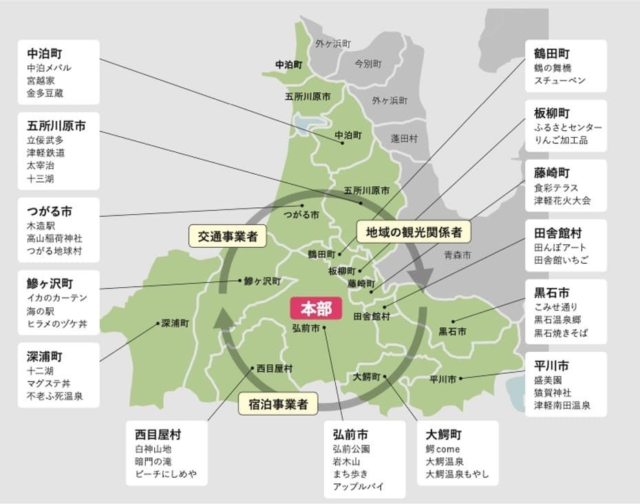 これまで各自治体個別で行ってきた観光誘致などの取り組みをより効率的、効果的に実行するべく、令和2年、現職の弘前市長(櫻田 宏 氏)を理事長に地域連携DMO 一般社団法人 Clan PEONY 津軽(クランピオニー つがる)を発足させ、認知拡大を図っております。