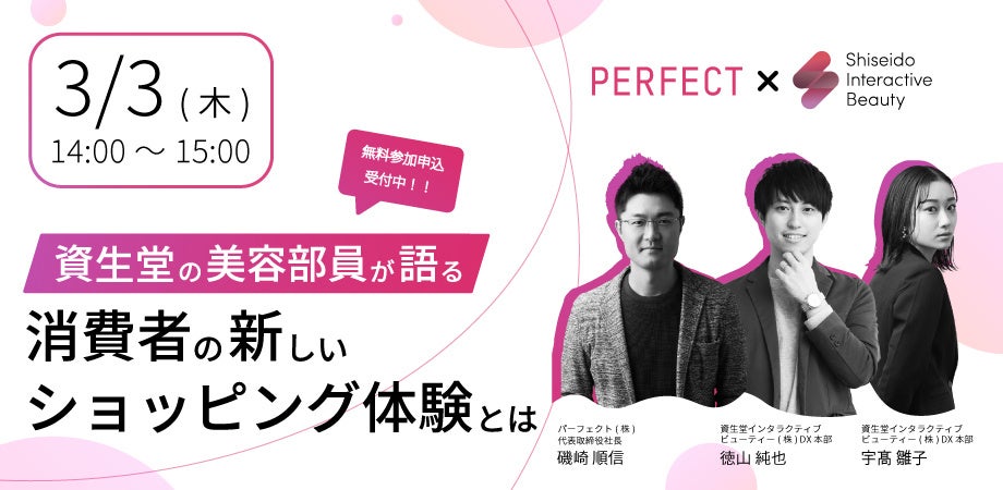 日本・東京(2022年3月2日)- ARおよびAI技術を活用したソリューションサービスを提供し、美容業界とファッション業界でデジタルトランスフォーメーション(DX)を奨励するパーフェクト株式会社は、3月3日(木)14時より、「資生堂の美容部員が語る消費者の新しいショッピング体験とは」をテーマに、資生堂インタラクティブビューティーの徳山氏と宇髙氏を招待し、無料オンラインビジネスセミナーを開催致します。