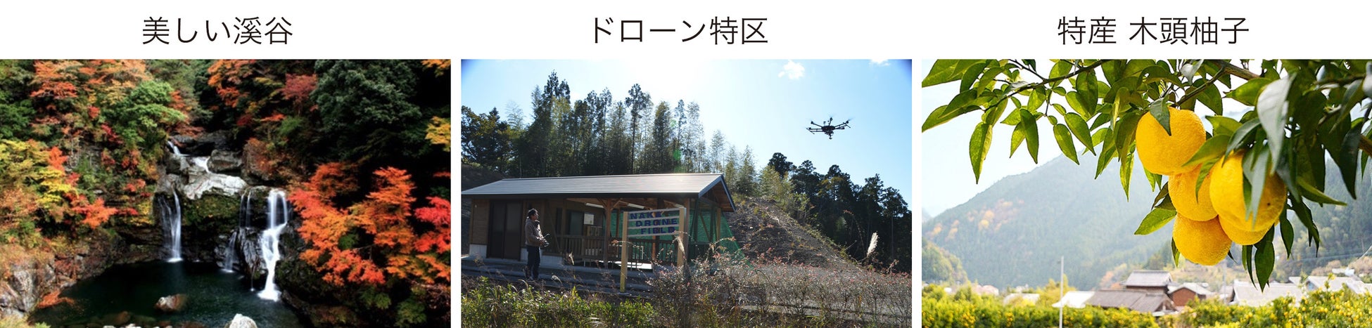 那賀町は、森林や広大な川を中心とする豊かな自然、名瀑や樹氷など神々しい自然が身近にあるとても魅力的な町です。全国の産地で植えられている本柚子の元と言われている、木頭柚子(きとうゆず)や、高品質の国産木材である木頭杉(きとうすぎ)等の特産品もあります。また、「徳島県版ドローン特区」に認定されており、役場には全国的にも珍しい専門部署「ドローン推進室」が設置され、「日本一ドローンが飛ぶまち」をめざす町づくりに取り組んでいます。
