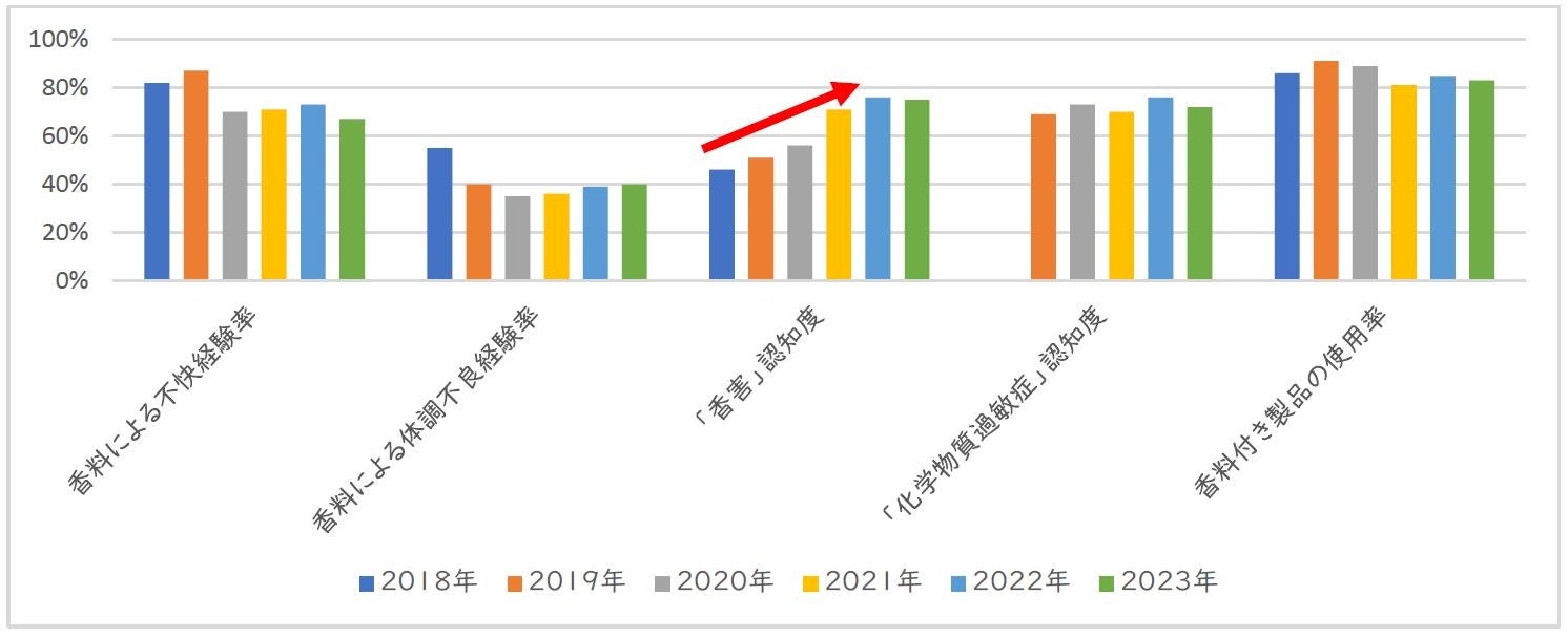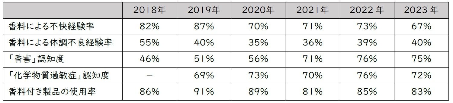 2023年にシャボン玉石けんが行った調査によると、人工的な香料で67%が不快な思いを経験し、40%が体調不良を経験していることが分かりました。また、直近6年間の調査結果からは、7~8割の方が「香料による不快な経験をしたことがある」、約4割が「香料による体調不良を経験したことがある」ということが分かっています。香料による不快もしくは体調不良を経験したことのある方は一定数いるにも関わらず、香料付き製品の使用率は8~9割と高い水準です。「香害」や「化学物質過敏症」の認知度は高まっていますが、誰もが発症する可能性があることや、社会的な理解・配慮が必要なこと等をさらに啓発していく必要があります。
