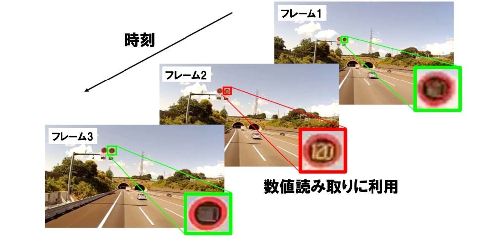 (例:LED式の速度制限標識の数値は映像に映らない瞬間があるが、適切な瞬間を選ぶことで読み取りが可能。)
