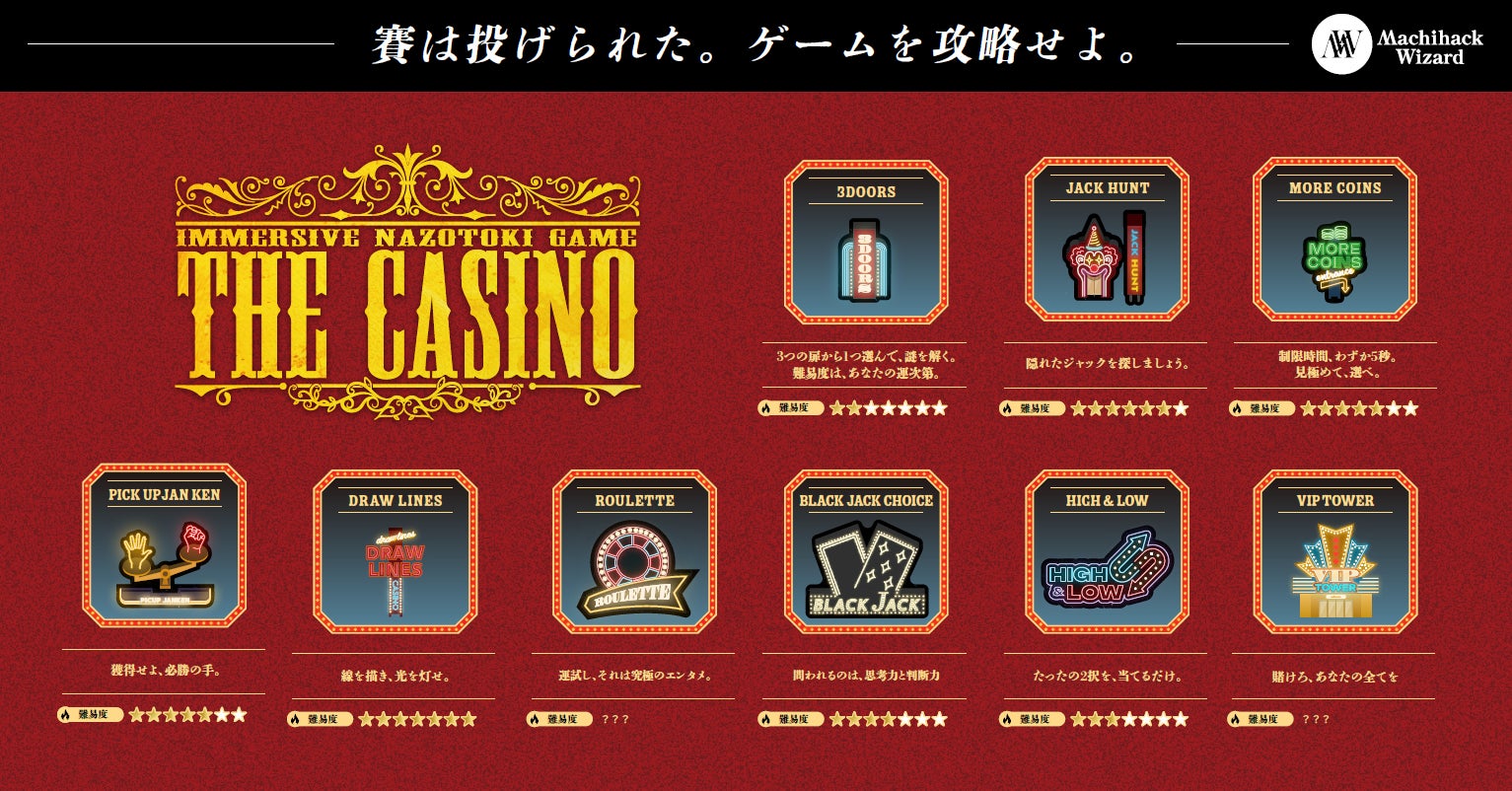 いくつもの頭脳戦を遊び尽くせる、本格謎解きゲーム『THE CASINO -immersive nazotoki game-』が街ハックウィザードから登場。2025年11月8日(土)より発売開始。