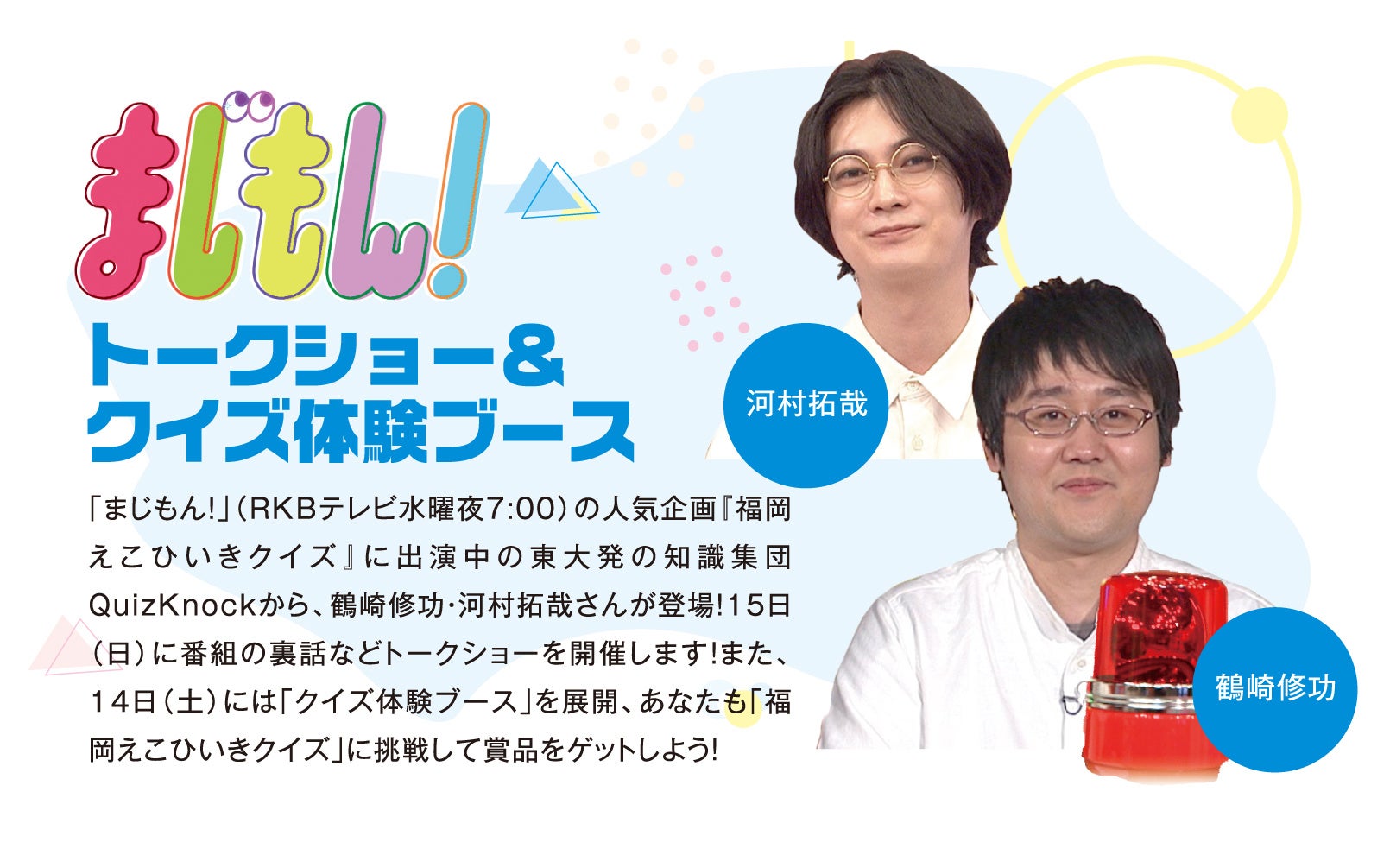 RKBテレビで毎週水曜夜7時から放送中の「まじもん!」の人気企画【福岡えこひいきクイズ】から、天才頭脳集団「QuizKnock」の鶴崎修功さんと河村拓哉さんがやってきます!
