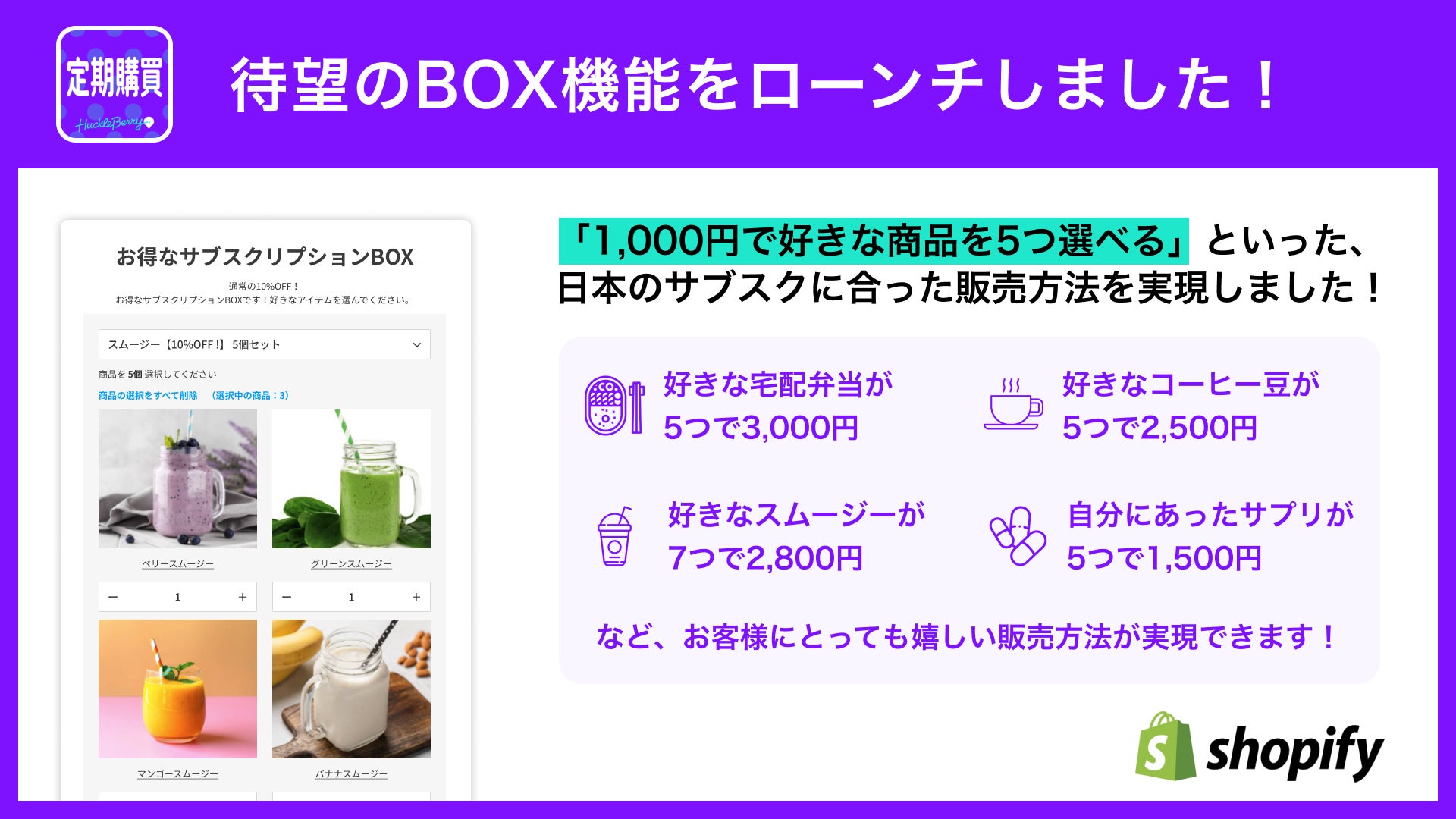 株式会社ハックルベリー(東京都渋谷区、代表取締役社長:安藤 祐輔、以下「ハックルベリー」)が提供する定期購買APIに対応した日本初のShopify(ショッピファイ)アプリ「定期購買」で、「BOX機能」をリリースしたことをお知らせします。