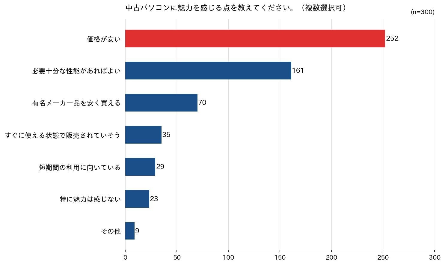中古パソコンに魅力を感じる点(複数選択)では、「価格が安い」が252件でダントツのトップ。次いで「必要十分な性能があればよい」161件、「有名メーカー品を安く買える」70件と続きます。