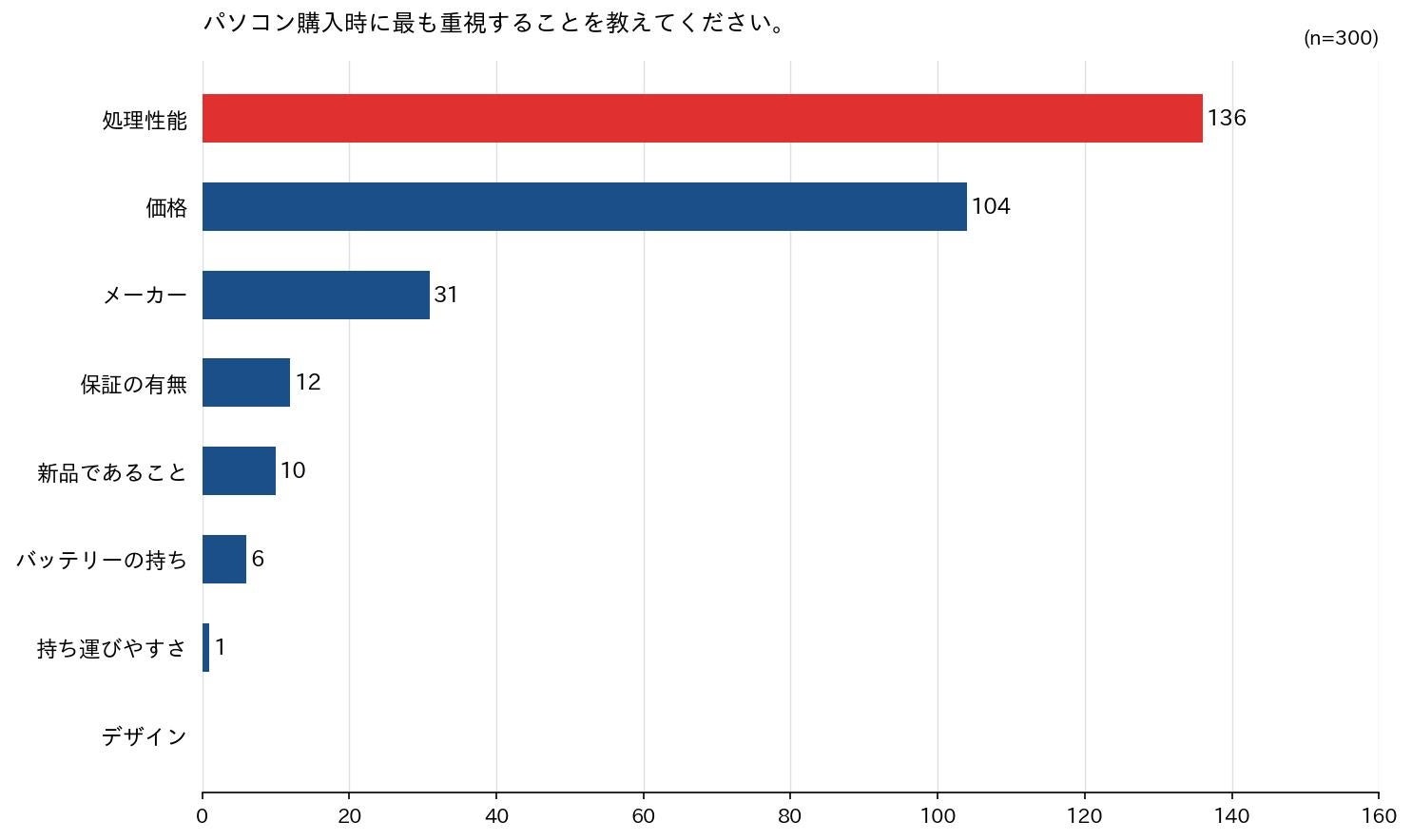 パソコン購入時に最も重視することを聞くと、「処理性能」が136件でトップ。次いで「価格」が104件と続きました。「メーカー」(31件)、「保証の有無」(12件)、「新品であること」(10件)は少数にとどまっています。