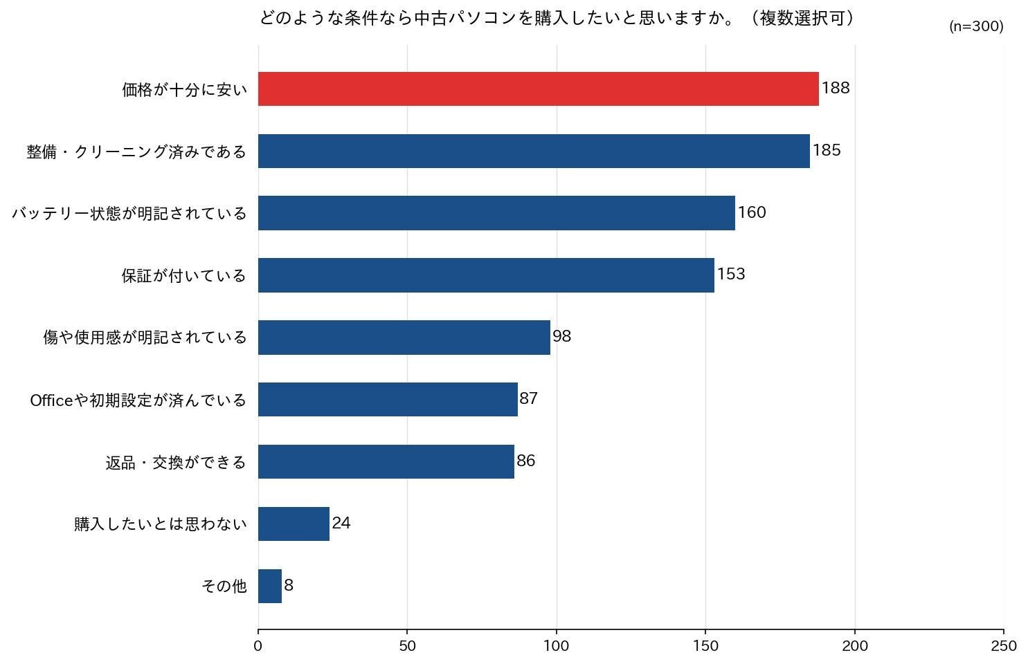 どのような条件なら中古パソコンを購入したいかを複数選択で聞くと、「価格が十分に安い」が188件、「整備・クリーニング済みである」が185件でほぼ並ぶ形でトップ2に。「バッテリー状態が明記されている」160件、「保証が付いている」153件も過半数を超えています。