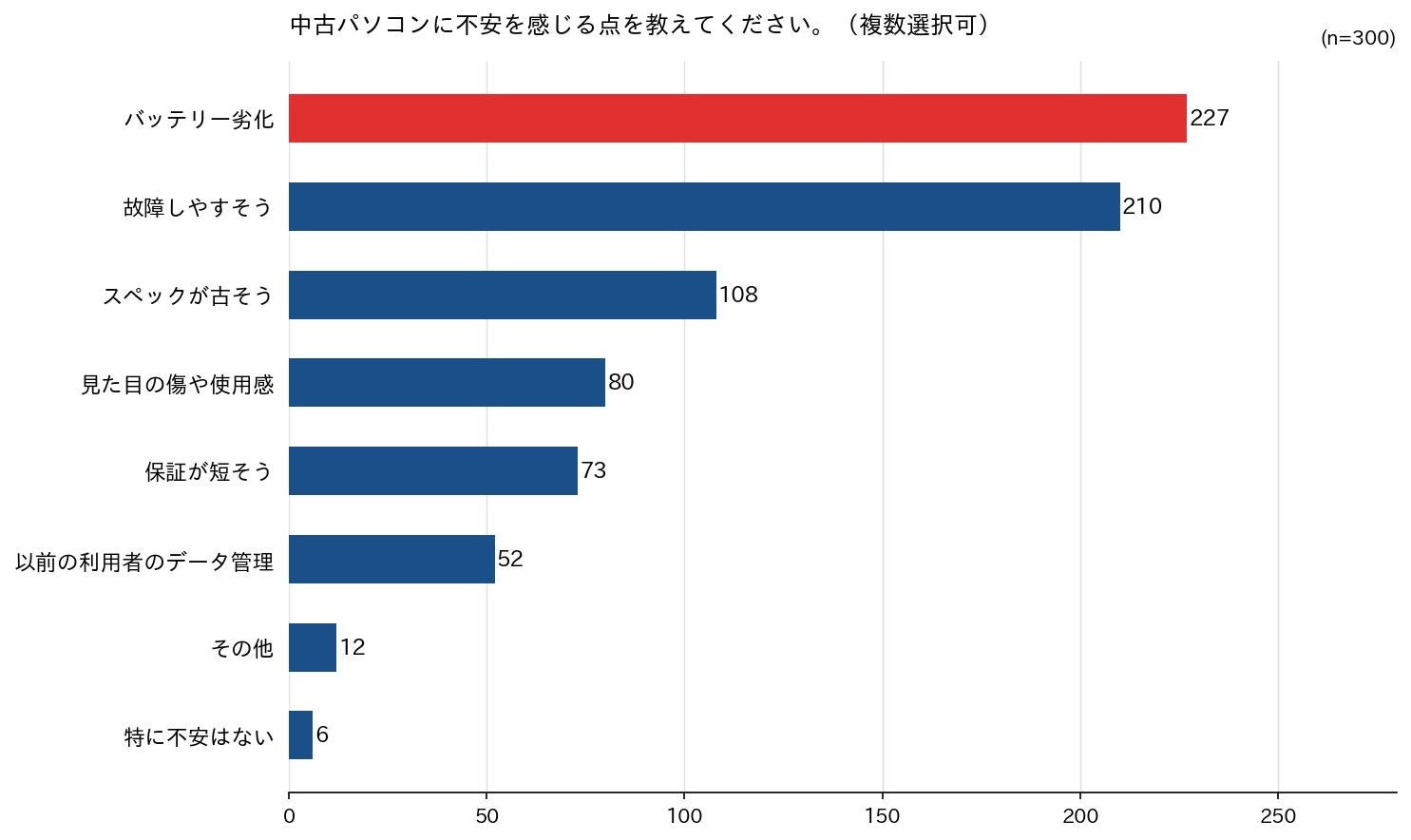 中古パソコンへの不安(複数選択)を聞くと、「バッテリー劣化」が227件で最多、次いで「故障しやすそう」が210件と、回答者の多くが物理的な品質劣化を懸念しています。