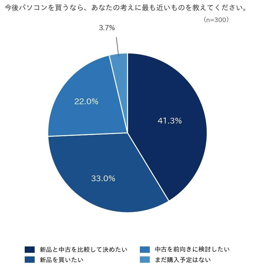今後パソコンを購入するとしたら、という問いでは「新品と中古を比較して決めたい」が41.3%で最多。「新品を買いたい」(33.0%)、「中古を前向きに検討したい」(22.0%)と続きます。比較検討層(41.3%)と中古積極層(22.0%)を合計すると63.3%が中古を視野に入れており、中古パソコン市場には大きな潜在需要があることが確認されました。