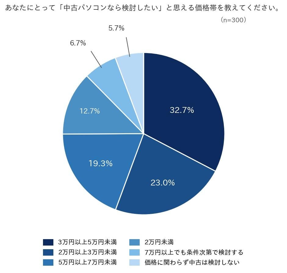 中古パソコンを検討したいと思える価格帯については、「3万円以上5万円未満」が32.7%で最多。「2万円以上3万円未満」(23.0%)、「5万円以上7万円未満」(19.3%)と続きます。
