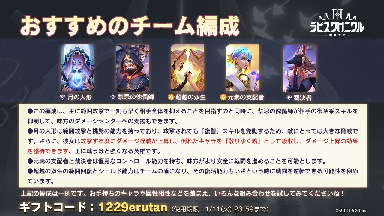 この編成は、主に範囲攻撃で一刻も早く相手全体を抑えることを目指すのと同時に、禁忌の傀儡師が相手の復活系スキルを抑制して、味方のダメージセンターへの支援もできます。