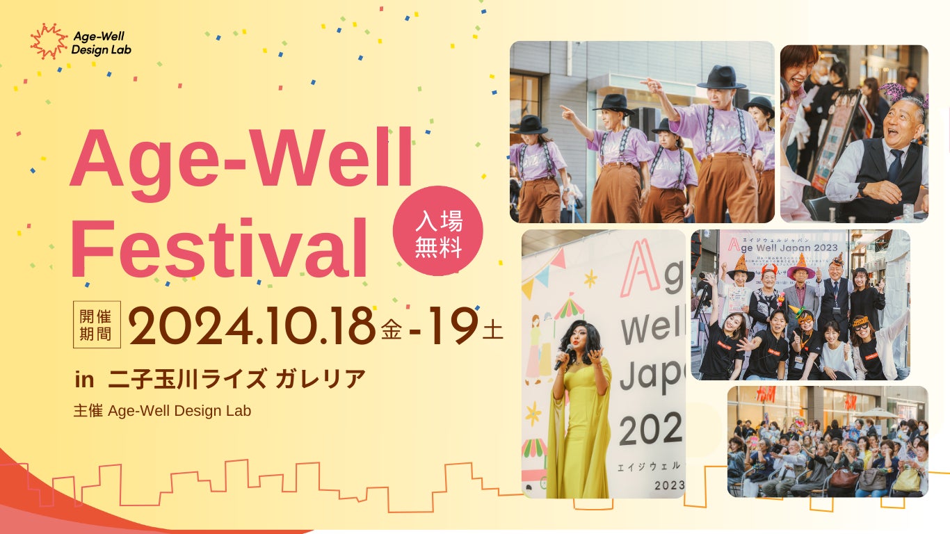 「Age-Well Design Lab」は、2024年10月18日(金)と19日(土)に「Age-Well Festival 」を二子玉川ライズ ガレリアにて開催いたします。2024年も昨年に引き続き、未来の超高齢社会を体感できる国内最大規模のイベントとして、シニア世代とその家族をはじめ、様々な関係者が集う場となります。