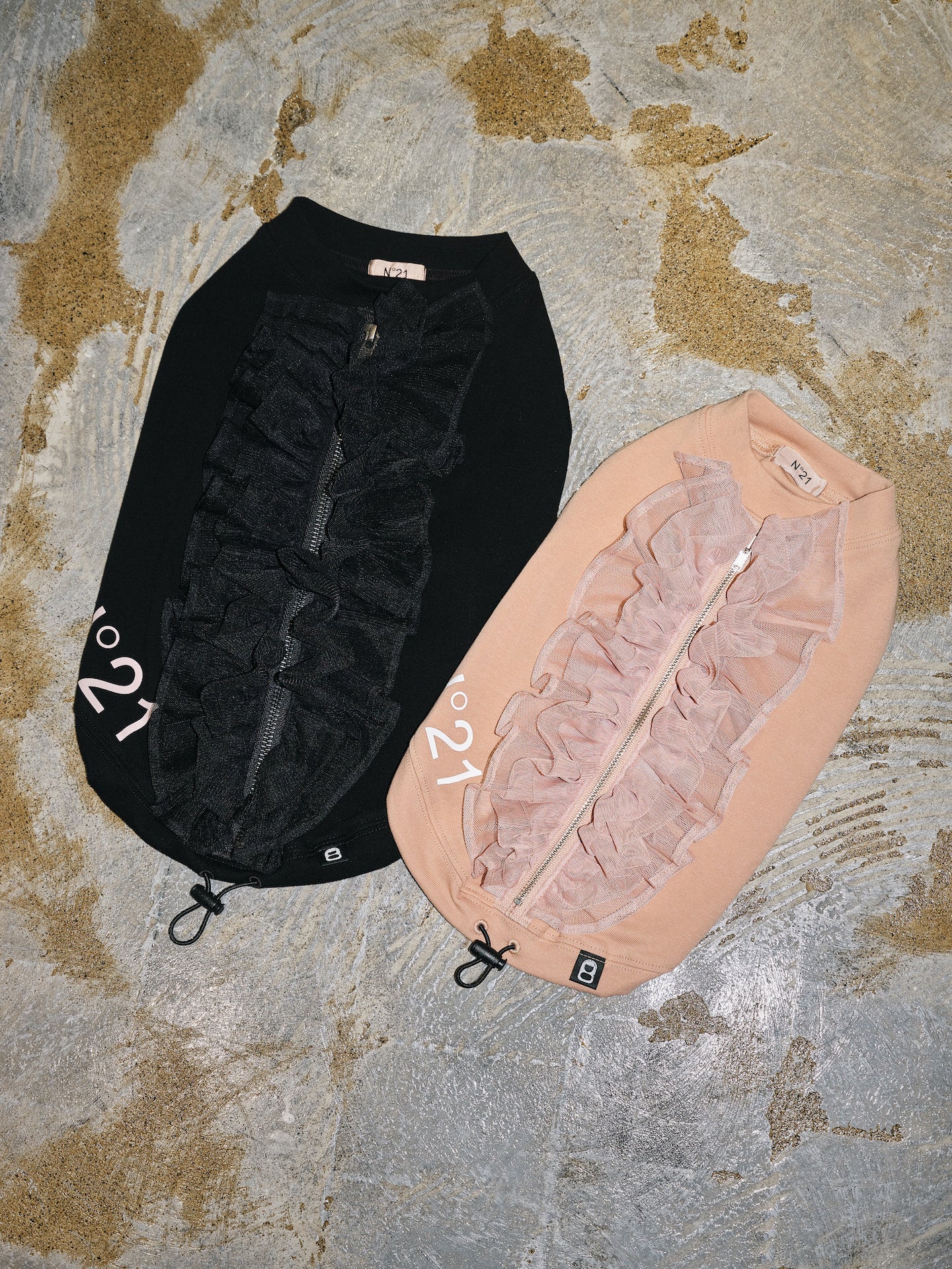 華やかなチュールフリルを施したタンクトップ。しっかりとしたコットン地をベースに、犬の体格や動きを考えた綺麗なシルエットです。フリル中心にあるジップがモードな印象で、存在感のある1枚。裾のドローストリングで着丈を調整可能で、愛犬のお好みのフィット感に合わせることができます。ブラックとピンクベージュの2色のご用意です。