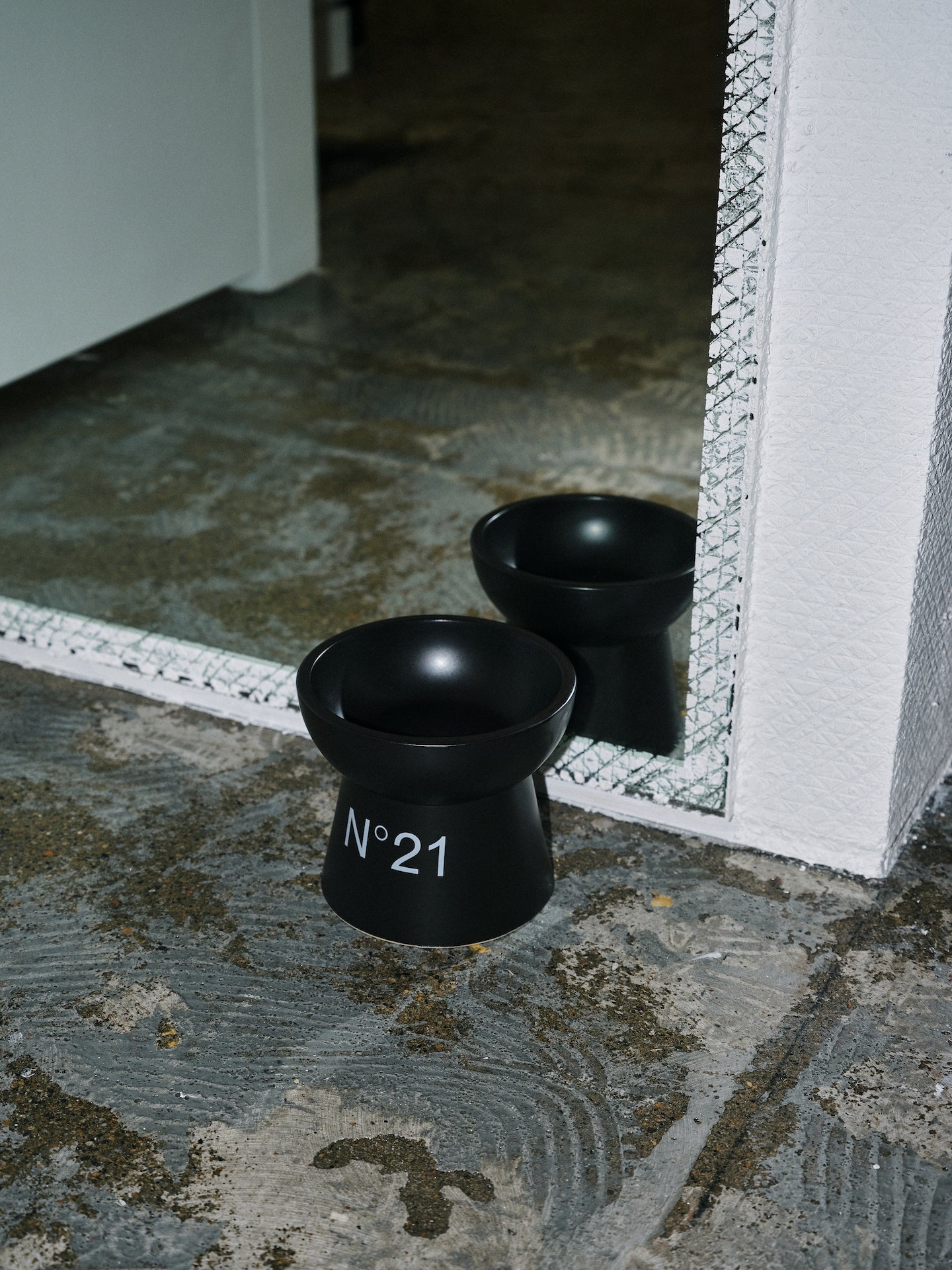 N21ロゴ入りフードボウル。色付けは愛犬の身体に無害な釉薬を使用しており、程よい重量で安定感があります。高さを出すことで、身体の負担を軽減し、快適に食事を楽しむことができます。マットブラックのお色味とシンプルなデザインは、様々なインテリアとも相性が良く馴染みます。