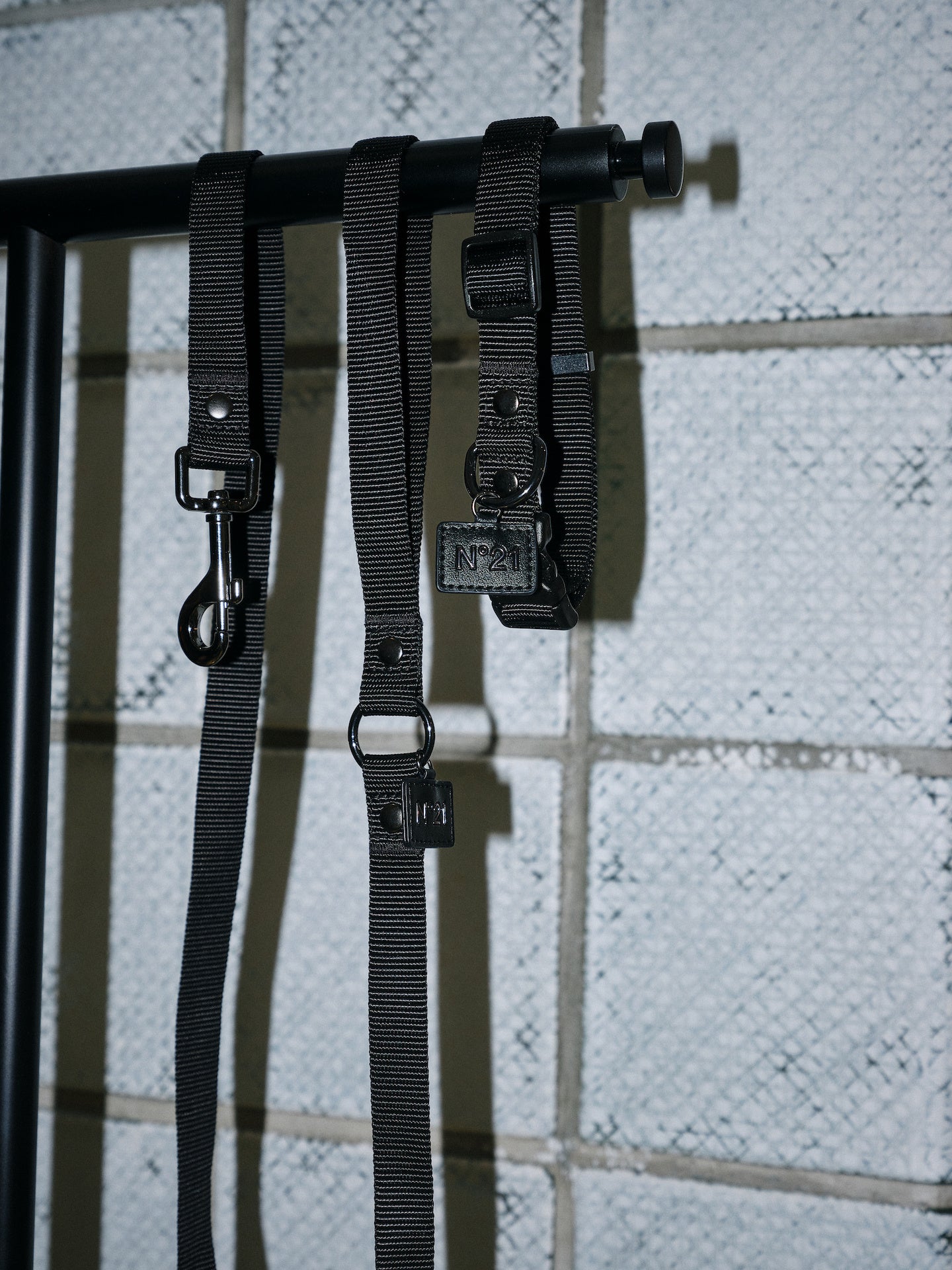 N21のロゴチャーム付きの首輪。耐水性・耐久性・柔らかさを兼ね備えたポリエステル100%のテープを使用しています。お手入れも簡単ですので、毎日のお散歩に最適なデザインです。リード付きでギフトにもおすすめ。