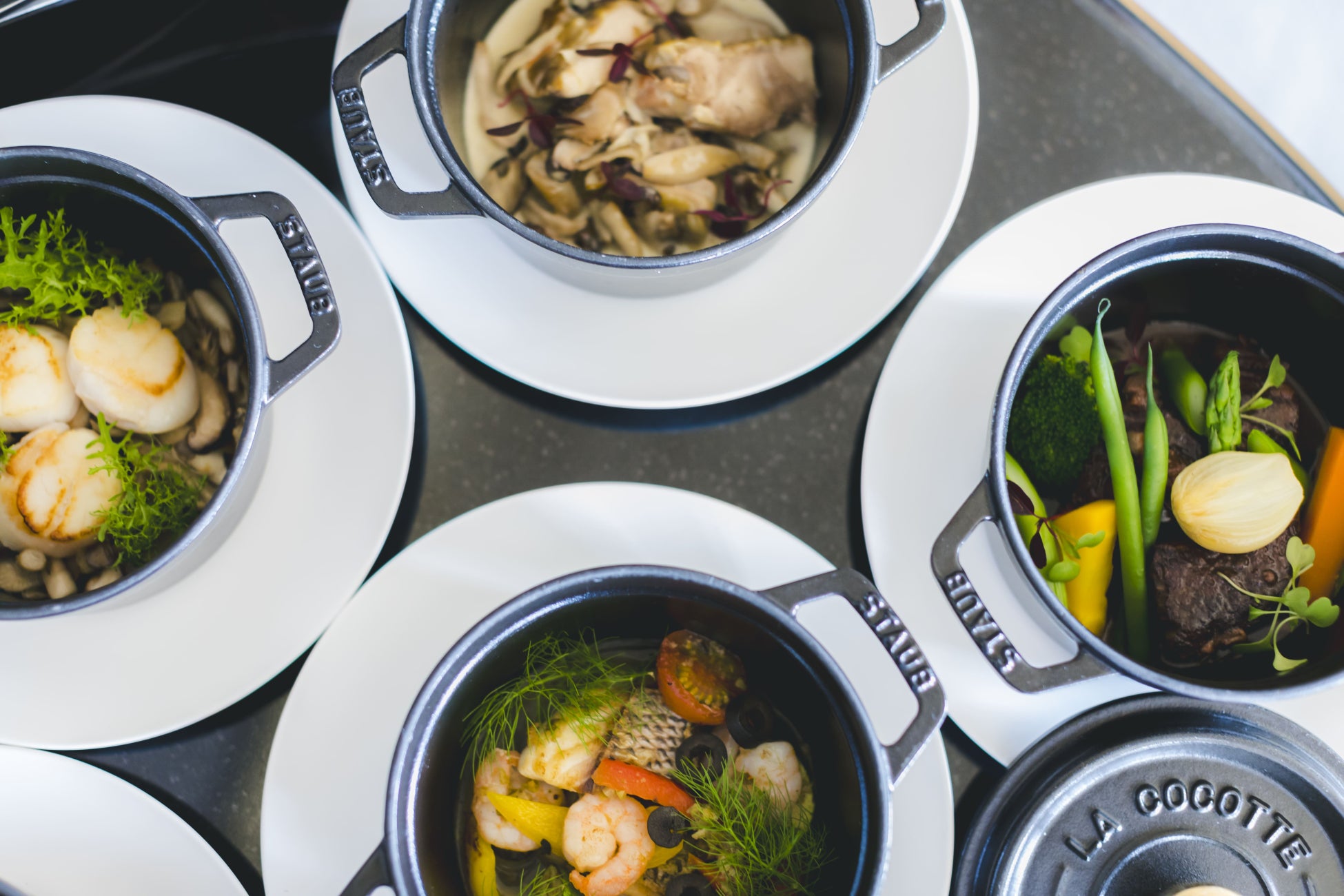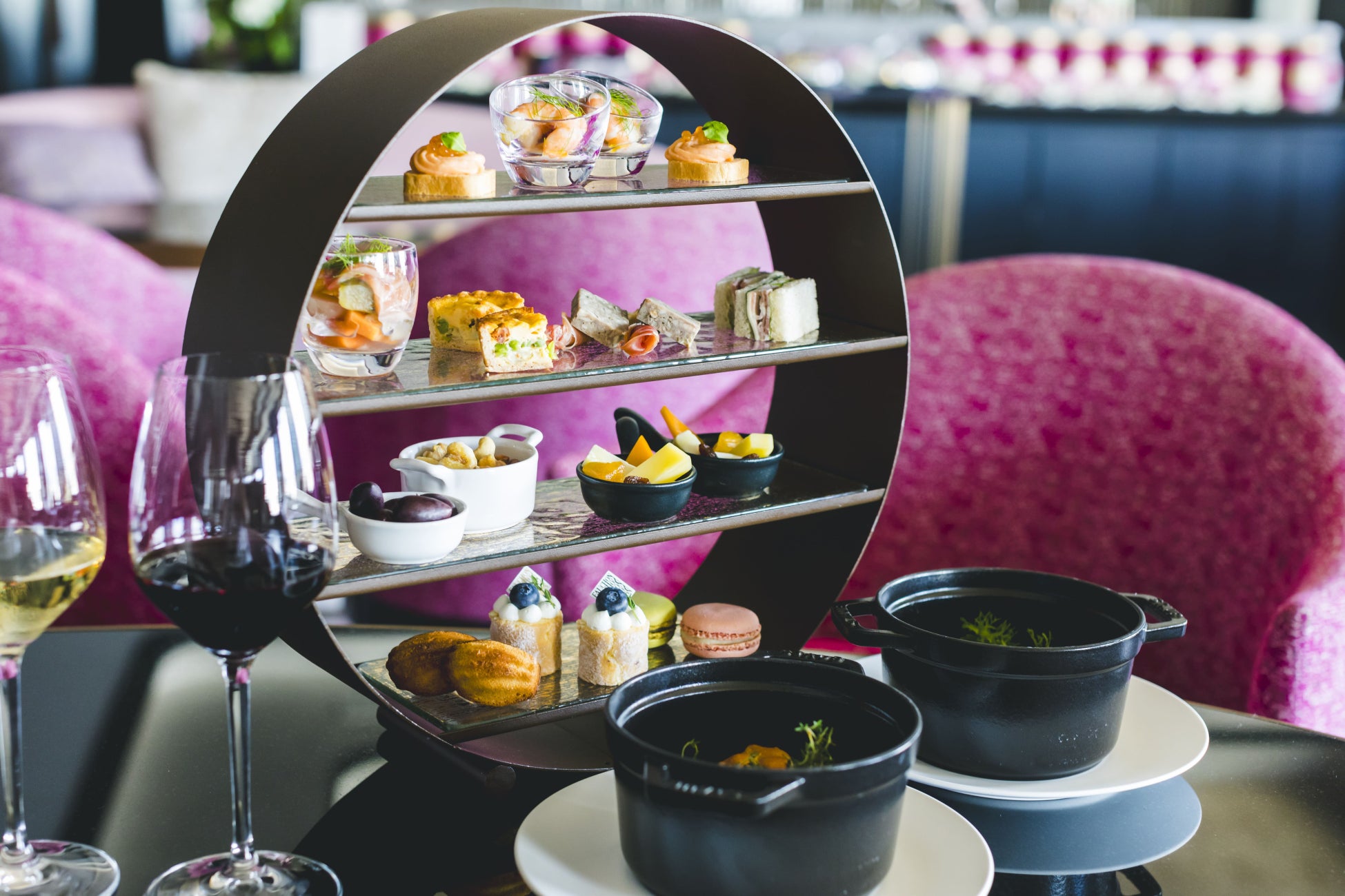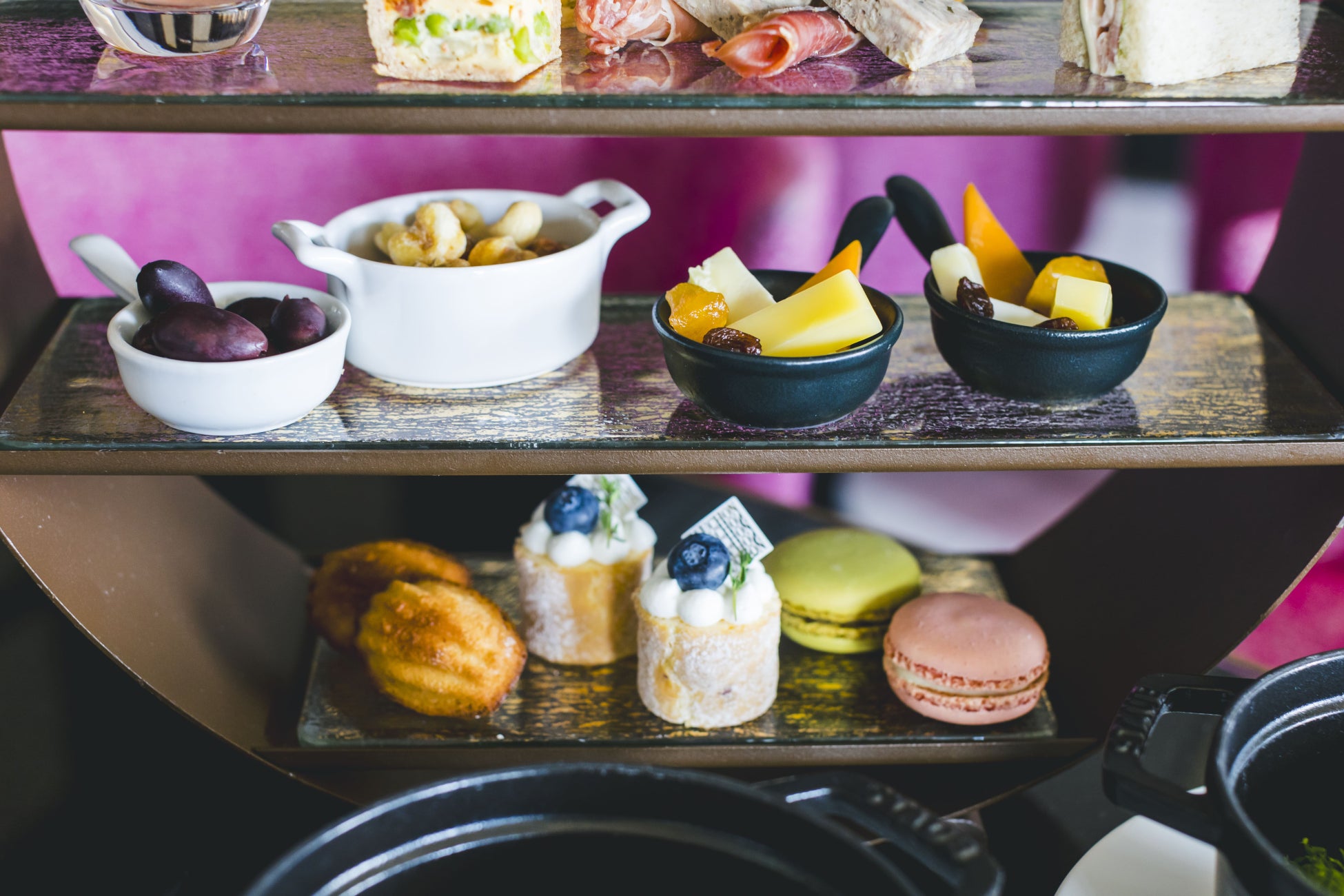 「サロン ド テ フォション」では、フィンガーフードサイズのフレンチおつまみとプチスイーツが並んだスタンドに、ココットに入った選べるメインとワインとビールのフリーフローがついたハイティーセットが新たに10月1日よりスタート。