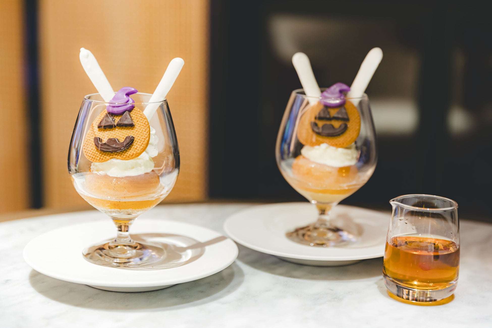 コウモリが羽ばたくマロンオペラや、ひとつ目リュネットなど、可愛いホラースイーツが並びます。竹炭パウダーを使用し、ミイラをイメージしたアメリカンドッグは一口で。たっぷり洋酒が染み込んだしっとり大人な味わいのババパルフェにはおばけクッキーがトッピング。今期のウェルカムティーもグランティーマスター自慢のオリジナルレシピで20時間以上かけて抽出したアイスティーをお楽しみいただけます。お好きなタイミングで「トリック・オア・トリート!」の合言葉を言うと、ホテル特製スイーツがサーブされる遊び心も。