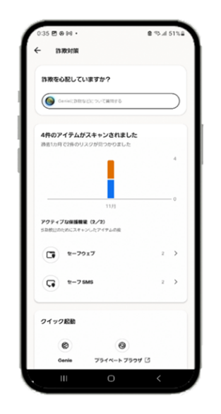 ノートンGenie(AIアシスタント):怪しいメッセージへのアドバイスや詐欺判定をワンタップで実現。さらに、サイバーセーフティやノートン製品に関する情報も案内可能。