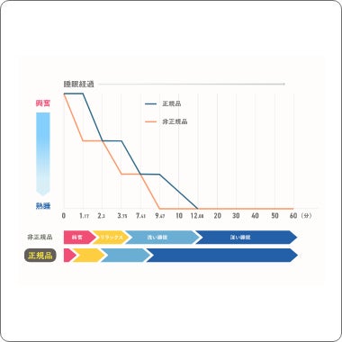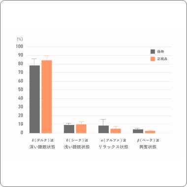 正規品の着装により、興奮度を示すβ波が有意に低下した。同様に、熟睡状況を示すδ波が高頻度で現れる傾向を示した。