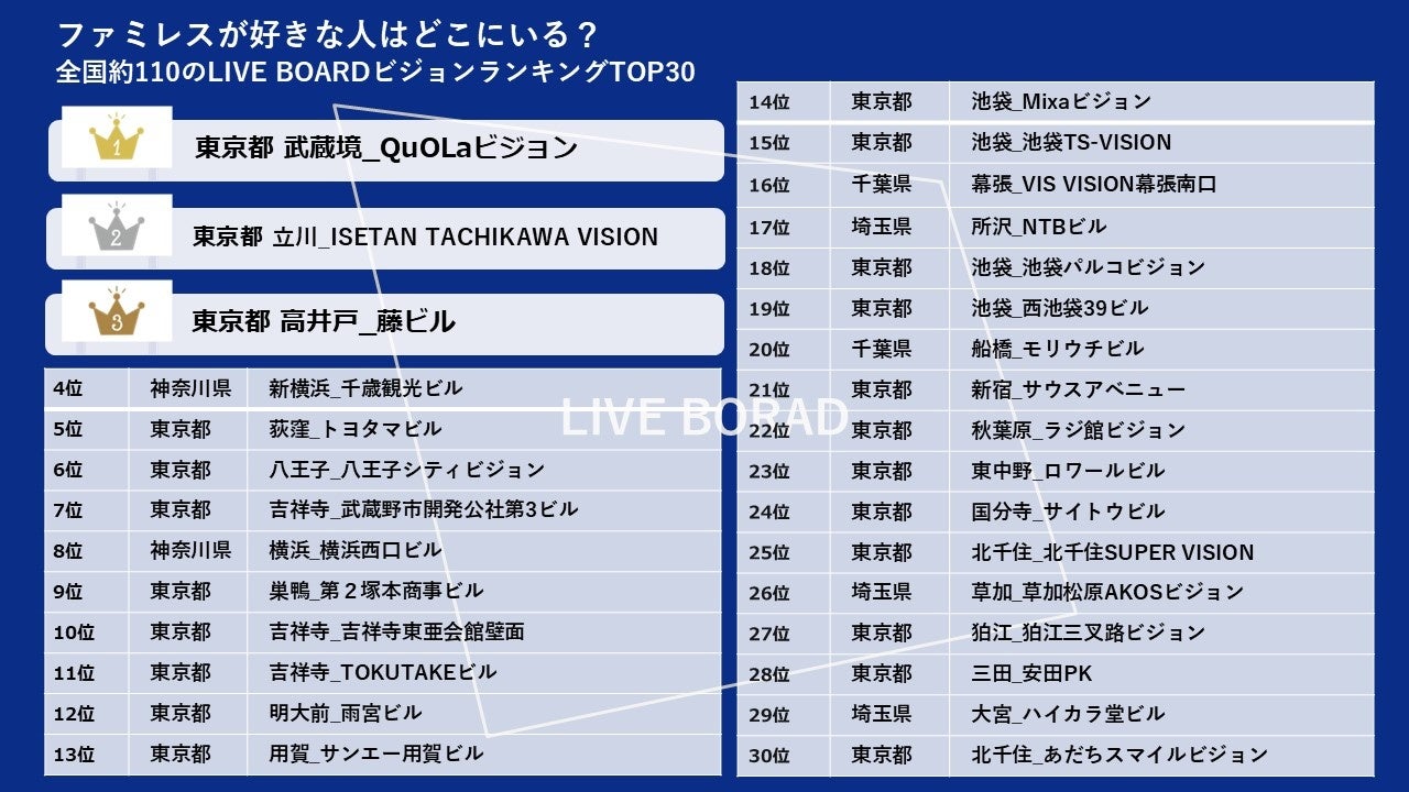 “ファミレスが好きな人”はどこにいる?全国のLIVE BOARD屋外ビジョンランキングTOP30を発表