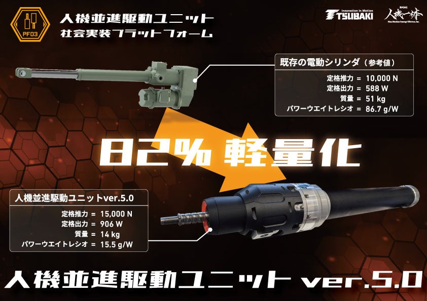 先端ロボット工学技術の社会実装を目指す株式会社人機一体(本社:滋賀県草津市、代表取締役社長:金岡博士、以下「人機一体」)は、株式会社椿本チエイン(本社:大阪市北区、代表取締役社長:木村 隆利、以下「椿本チエイン」)との事業連携による成果として、高出力・高耐衝撃性を備えた電動シリンダの PoC(※1)試作機「人機並進駆動ユニット ver.6.0」を開発いたしました。