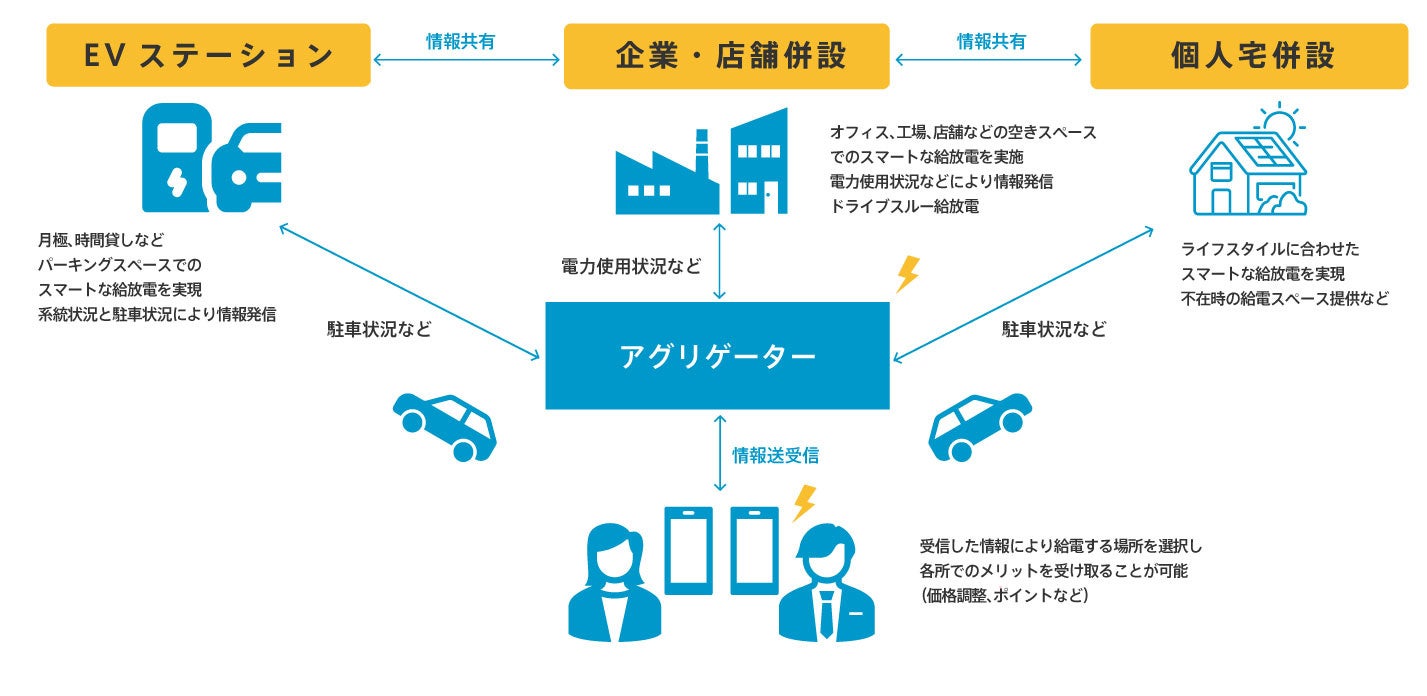エネルギー・リソース・アグリゲーションとは、蓄電池や電気自動車(以下、EV)などの分散型エネルギーリソースを束ねて制御することによって、電力の需要と供給のバランスを調整することです。再生可能エネルギー主力電源化を推進する中で必要とされる調整力の確保やリソース提供側への経済的メリット、最適な制御による電気料金の削減など、様々なメリットがあります。