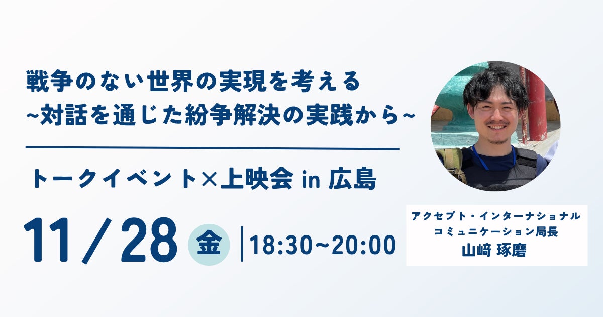 世界の紛争解決への取り組みを続け、「情熱大陸」などでもその活動が話題になったNPO法人アクセプト・インターナショナル(東京都中央区、代表理事:永井陽右)が、広島市にて初めてトークイベントを開催します。