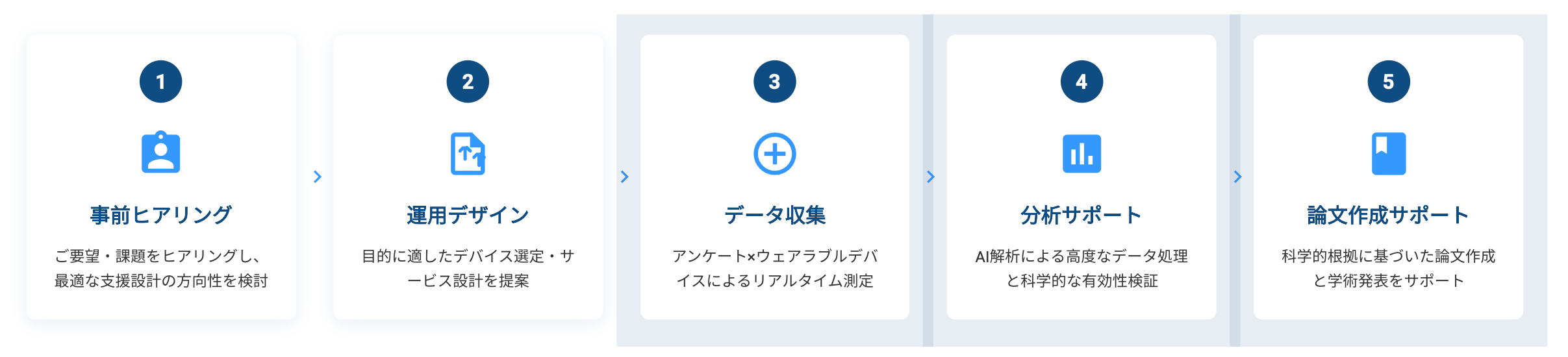 本サービスは、アンケートによる主観評価とウェアラブルデバイスの客観データを融合した一貫体制により、食品ヒト試験におけるエビデンス構築をワンストップで支援いたします。運用デザインからデータ取得、解析、さらには論文作成支援まで、専門家チームが全プロセスをきめ細かくフォローいたします。